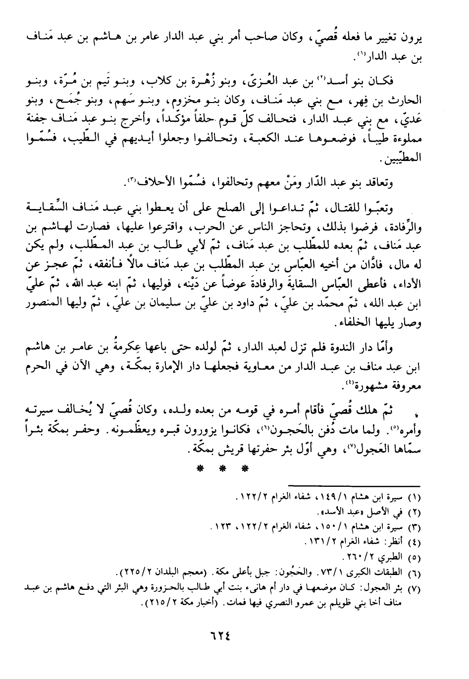 فَكَانَ بَنُو أَسَدِ بْنِ عَبْدِ الْعُزَّى، وَبَنُو زُهْرَةَ بْنِ كِلَابٍ، وَبَنُو تَيْمِ بْنِ مُرَّةَ، وَبَنُو الْحَارِثِ بْنِ فِهْرٍ مَعَ بَنِي عَبْدِ مَنَافٍ، وَكَانَ بَنُو مَخْزُومٍ، وَبَنُو سَهْمٍ، وَبَنُو جُمَحٍ، وَبَنُو عَدِيٍّ مَعَ بَنِي عَبْدِ الدَّارِ، فَتَحَالَفَ كُلُّ قَوْمٍ حِلْفًا مُؤَكَّدًا، وَأَخْرَجَ بَنُو عَبْدِ مَنَافٍ جَفْنَةً مَمْلُوءَةً طِيبًا فَوَضَعُوهَا عِنْدَ الْكَعْبَةِ وَتَحَالَفُوا وَجَعَلُوا أَيْدِيَهُمْ فِي الطِّيبِ، فَسُمُّوا الْمُطَيَّبِينَ. وَتَعَاقَدَ بَنُو عَبْدِ الدَّارِ وَمَنْ مَعَهُمْ وَتَحَالَفُوا فَسُمُّوا الْأَحْلَافَ، وَتَعَبَّوْا لِلْقِتَالِ، ثُمَّ تَدَاعَوْا إِلَى الصُّلْحِ عَلَى أَنْ يُعْطُوا بَنِي عَبْدِ مَنَافٍ السِّقَايَةَ وَالرِّفَادَةَ، فَرَضُوا بِذَلِكَ وَتَحَاجَزَ النَّاسُ عَنِ الْحَرْبِ وَاقْتَرَعُوا عَلَيْهَا، فَصَارَتْ لِهَاشِمِ بْنِ عَبْدِ مَنَافٍ، ثُمَّ بَعْدَهُ لِلْمُطَّلِبِ بْنِ عَبْدِ مَنَافٍ، ثُمَّ لِأَبِي طَالِبِ بْنِ عَبْدِ الْمُطَّلِبِ، وَلَمْ يَكُنْ لَهُ مَالٌ فَادَّانَ مِنْ أَخِيهِ الْعَبَّاسِ بْنِ عَبْدِ الْمُطَّلِبِ بْنِ عَبْدِ مَنَافٍ مَالًا فَأَنْفَقَهُ، ثُمَّ عَجِزَ عَنِ الْأَدَاءِ فَأَعْطَى الْعَبَّاسَ السِّقَايَةَ وَالرِّفَادَةَ عِوَضًا عَنْ دَيْنِهِ، فَوَلِيَهَا، ثُمَّ ابْنُهُ عَبْدُ اللَّهِ، ثُمَّ عَلِيُّ بْنُ عَبْدِ اللَّهِ، ثُمَّ مُحَمَّدُ بْنُ عَلِيٍّ، ثُمَّ دَاوُدُ بْنُ عَلِيِّ بْنِ سُلَيْمَانَ بْنِ عَلِيٍّ، ثُمَّ وَلِيَهَا الْمَنْصُورُ وَصَارَ يَلِيهَا الْخُلَفَاءُ.