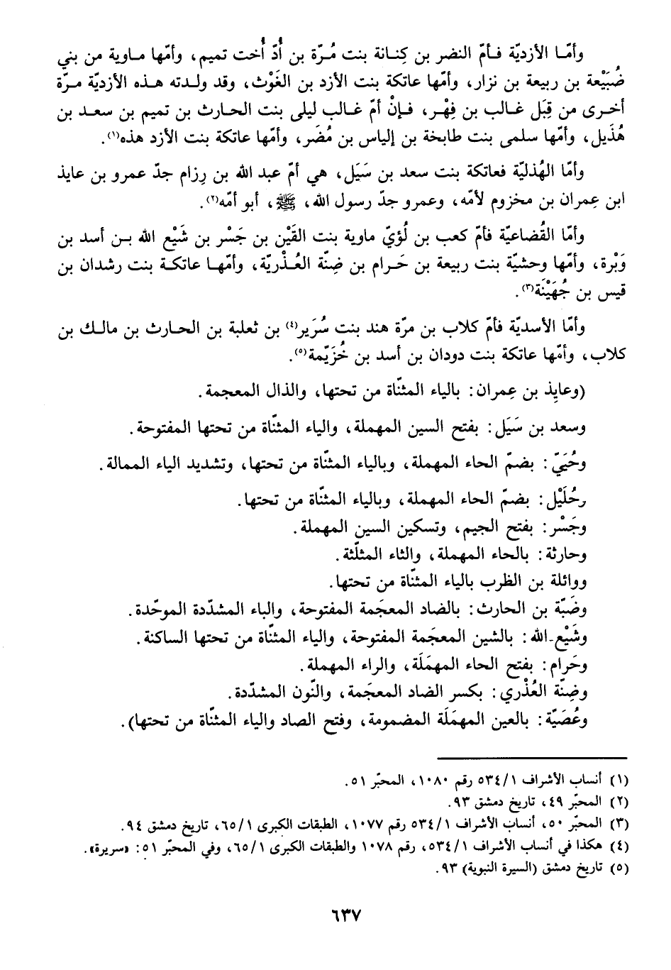 وَأَمَّا الْأَزْدِيَّةُ: فَأُمُّ النَّضْرِ بْنِ كِنَانَةَ بِنْتُ مُرَّةَ بْنِ أُدٍّ أُخْتِ تَمِيمٍ، وَأُمُّهَا مَاوِيَّةُ مِنْ بَنِي ضُبَيْعَةَ بْنِ رَبِيعَةَ بْنِ نِزَارٍ، وَأُمُّهَا عَاتِكَةُ بِنْتُ الْأَزْدِ بْنِ الْغَوْثِ، وَقَدْ وَلَدَتْهُ هَذِهِ الْأَزْدِيَّةُ مَرَّةً أُخْرَى مِنْ قِبَلِ غَالِبِ بْنِ فِهْرٍ، فَإِنَّ أُمَّ غَالِبٍ لَيْلَى بِنْتُ الْحَارِثِ بْنِ تَمِيمِ بْنِ سَعْدِ بْنِ هُذَيْلٍ، وَأُمُّهَا سَلْمَى بِنْتُ طَابِخَةَ بْنِ إِلْيَاسَ بْنِ مُضَرَ، وَأُمُّهَا عَاتِكَةُ بِنْتُ الْأَزْدِ هَذِهِ.