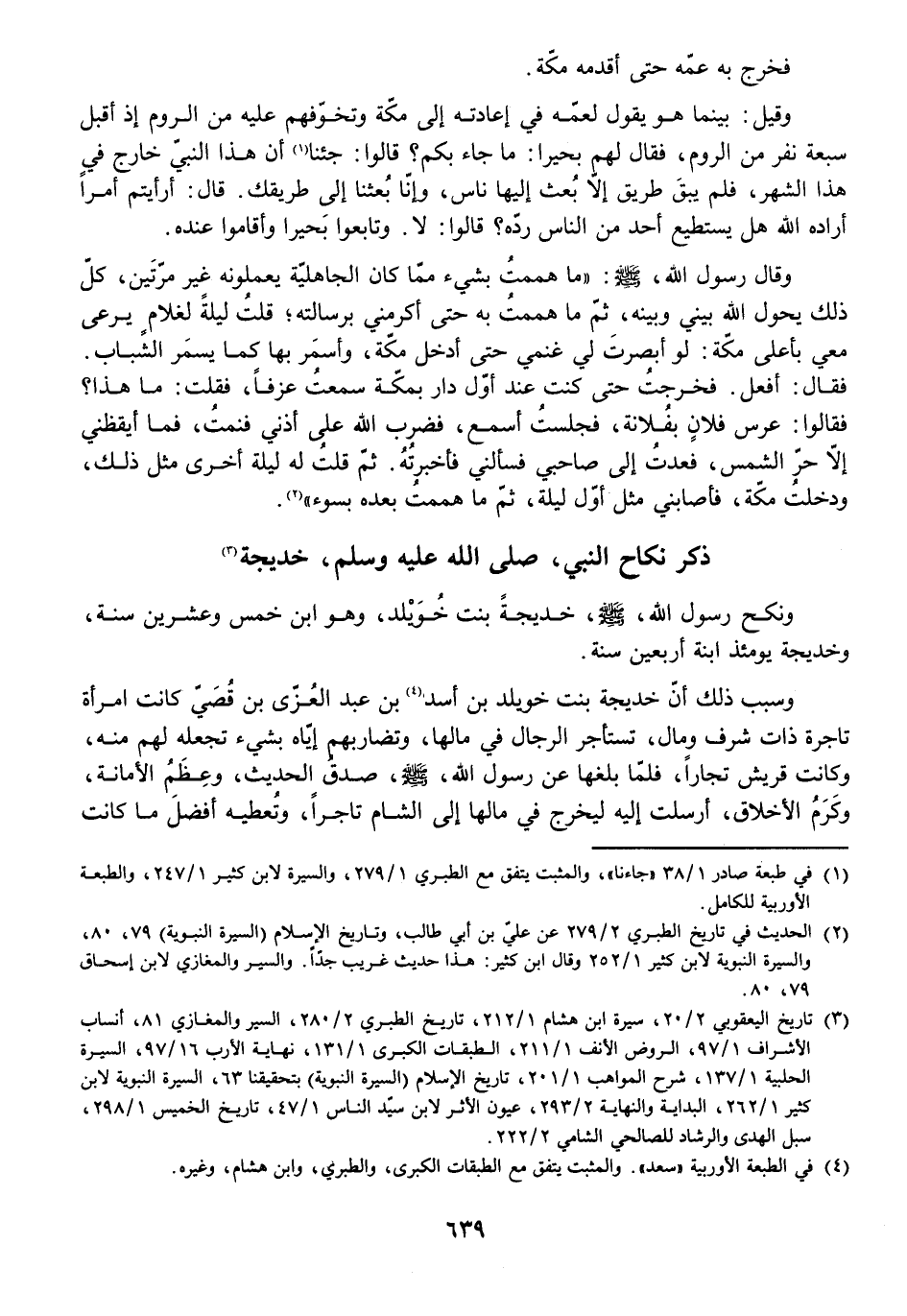 وَنَكَحَ رَسُولُ اللَّهِ - صَلَّى اللَّهُ عَلَيْهِ وَسَلَّمَ - خَدِيجَةَ بِنْتَ خُوَيْلِدٍ، وَهُوَ ابْنُ خَمْسٍ وَعِشْرِينَ سَنَةً، وَخَدِيجَةُ يَوْمَئِذٍ ابْنَةُ أَرْبَعِينَ سَنَةً.