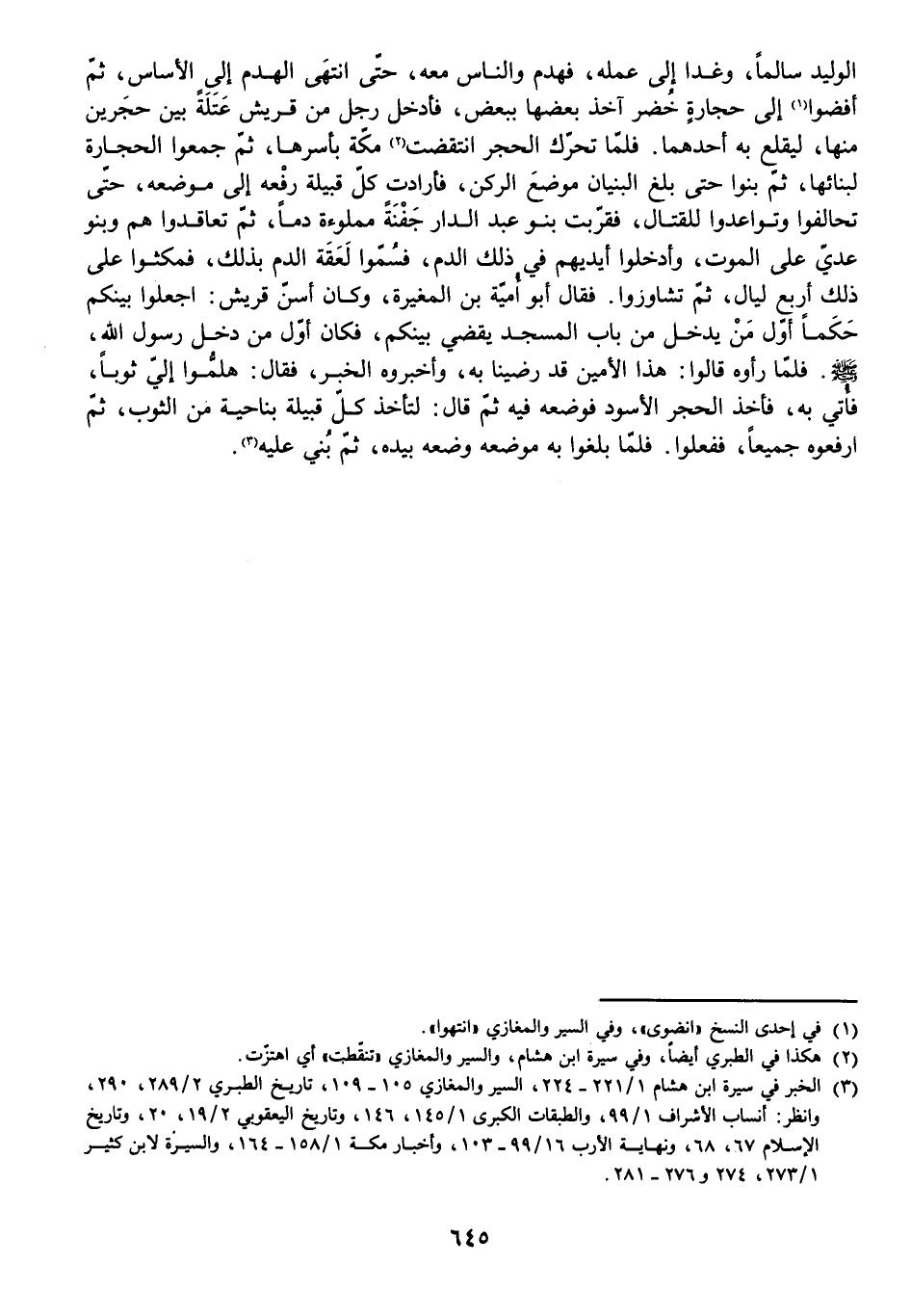 الْوَلِيدُ سَالِمًا وَغَدَا إِلَى عَمَلِهِ فَهَدَمَ وَالنَّاسُ مَعَهُ، حَتَّى انْتَهَى الْهَدْمُ إِلَى الْأَسَاسِ، ثُمَّ أَفْضَوْا إِلَى حِجَارَةٍ خُضْرٍ آخِذٌ بَعْضُهَا بِبَعْضٍ، فَأَدْخَلَ رَجُلٌ مِنْ قُرَيْشٍ عَتَلَةً بَيْنَ حَجَرَيْنِ مِنْهَا لِيَقْلَعَ بِهِ أَحَدَهُمَا. فَلَمَّا تَحَرَّكَ الْحَجَرُ انْتَقَضَتْ مَكَّةُ بِأَسْرِهَا، ثُمَّ جَمَعُوا لِبِنَائِهَا ثُمَّ بَنَوْا حَتَّى بَلَغَ الْبُنْيَانُ مَوْضِعَ الرُّكْنِ، فَأَرَادَتْ كُلُّ قَبِيلَةٍ رَفْعَهُ إِلَى مَوْضِعِهِ حَتَّى تَحَالَفُوا وَتَوَاعَدُوا لِلْقِتَالِ، فَقَرَّبَتْ بَنُو عَبْدِ الدَّارِ جَفْنَةً مَمْلُوءَةً دَمًا، ثُمَّ تَعَاقَدُوا هُمْ وَبَنُو عَدِيٍّ عَلَى الْمَوْتِ، وَأَدْخَلُوا أَيْدِيَهُمْ فِي ذَلِكَ الدَّمِ، فَسُمُّوا لَعْقَةَ الدَّمِ بِذَلِكَ، فَمَكَثُوا عَلَى ذَلِكَ أَرْبَعَ لَيَالٍ ثُمَّ تَشَاوَرُوا. فَقَالَ أَبُو أُمَيَّةَ بْنُ الْمُغِيرَةِ - وَكَانَ أَسَنَّ قُرَيْشٍ: اجْعَلُوا بَيْنَكُمْ حَكَمًا أَوَّلُ مَنْ يَدْخُلُ مِنْ بَابِ الْمَسْجِدِ يَقْضِي بَيْنَكُمْ، فَكَانَ أَوَّلَ مَنْ دَخَلَ رَسُولُ اللَّهِ - صَلَّى اللَّهُ عَلَيْهِ وَسَلَّمَ - فَلَمَّا رَأَوْهُ قَالُوا: هَذَا الْأَمِينُ قَدْ رَضِينَا بِهِ، وَأَخْبَرُوهُ الْخَبَرَ، فَقَالَ: «هَلُمُّوا إِلَيَّ ثَوْبًا، فَأُتِيَ بِهِ، فَأَخَذَ الْحَجَرَ الْأَسْوَدَ فَوَضَعَهُ فِيهِ ثُمَّ قَالَ: لِتَأْخُذْ كُلُّ قَبِيلَةٍ بِنَاحِيَةٍ مِنَ الثَّوْبِ ثُمَّ ارْفَعُوهُ جَمِيعًا. فَلَمَّا بَلَغُوا بِهِ مَوْضِعَهُ وَضَعَهُ بِيَدِهِ ثُمَّ بَنَى عَلَيْهِ.»