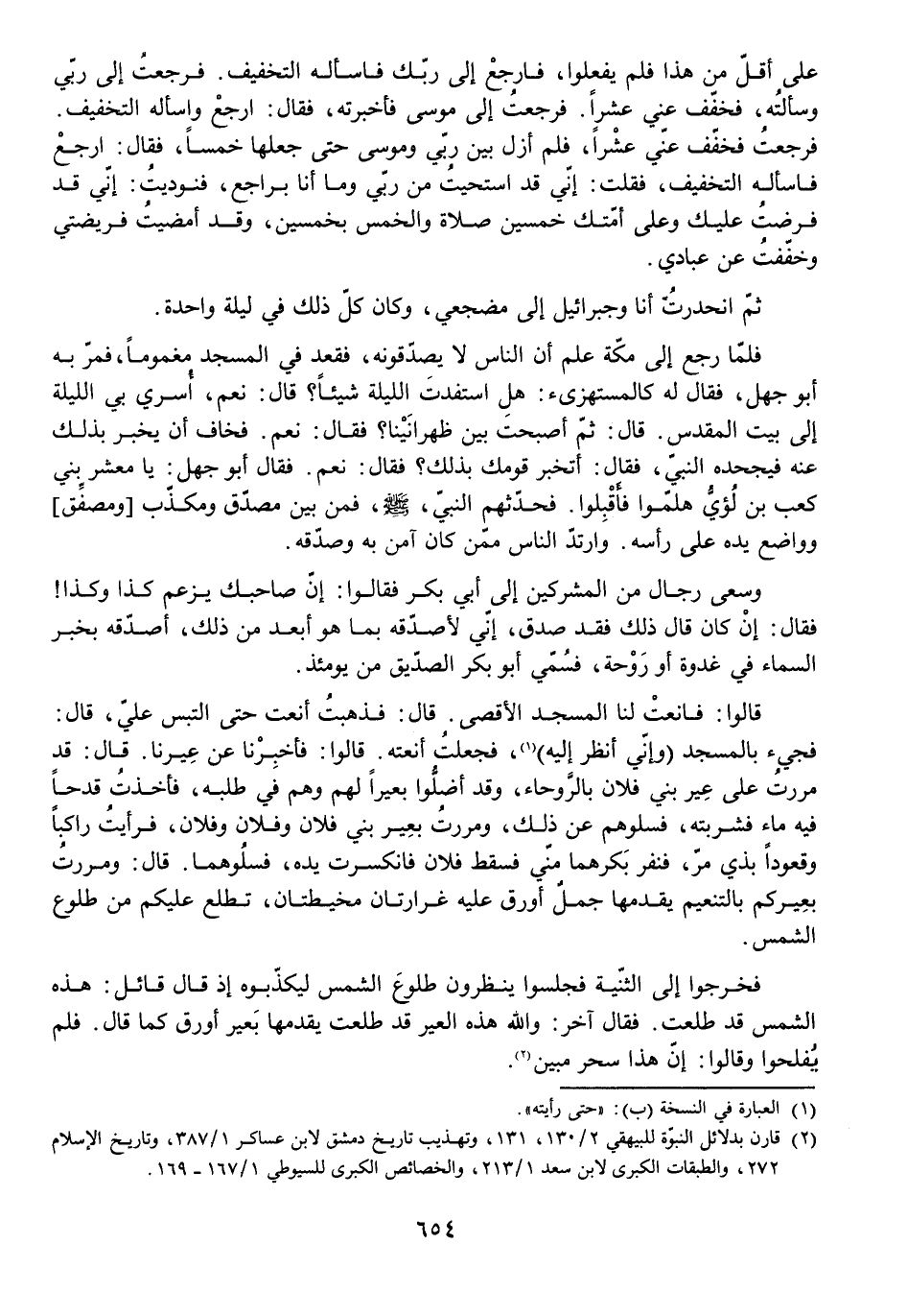 فَلَمَّا رَجَعَ إِلَى مَكَّةَ عَلِمَ أَنَّ النَّاسَ لَا يُصَدِّقُونَهُ، فَقَعَدَ فِي الْمَسْجِدِ مَغْمُومًا، فَمَرَّ بِهِ أَبُو جَهْلٍ، فَقَالَ لَهُ كَالْمُسْتَهْزِئِ: هَلِ اسْتَفَدْتَ اللَّيْلَةَ شَيْئًا؟ قَالَ: نَعَمْ، أُسْرِيَ بِي اللَّيْلَةَ إِلَى بَيْتِ الْمَقْدِسِ. قَالَ: ثُمَّ أَصْبَحْتَ بَيْنَ ظَهْرَانِينَا؟ فَقَالَ: نَعَمْ. فَخَافَ أَنْ يُخْبِرَ بِذَلِكَ عَنْهُ فَيَجْحَدَهُ النَّبِيُّ، فَقَالَ: أَتُخْبِرُ قَوْمَكَ بِذَلِكَ؟ فَقَالَ: نَعَمْ. فَقَالَ أَبُو جَهْلٍ: يَا مَعْشَرَ بَنِي كَعْبِ بْنِ لُؤَيٍّ هَلُمُّوا، فَأَقْبَلُوا. فَحَدَّثَهُمُ النَّبِيُّ - صَلَّى اللَّهُ عَلَيْهِ وَسَلَّمَ - فَمِنْ بَيْنِ مُصَدِّقٍ وَمُكَذِّبٍ، وَمُصَفِّقٍ وَوَاضِعٍ يَدَهُ عَلَى رَأْسِهِ. وَارْتَدَّ النَّاسُ مِمَّنْ كَانَ آمَنَ بِهِ وَصَدَّقَهُ.