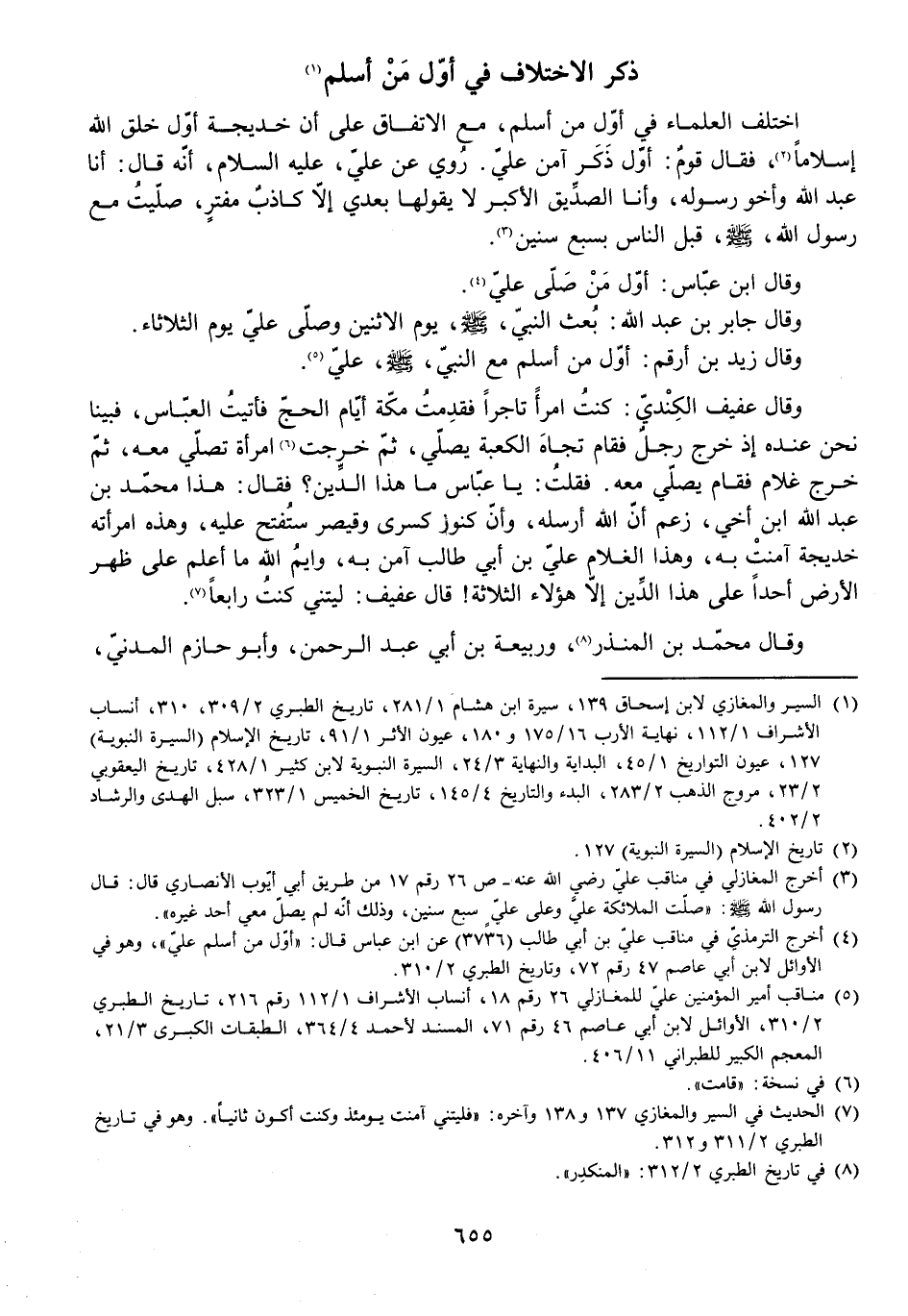 وَقَالَ ابْنُ عَبَّاسٍ: أَوَّلُ مَنْ صَلَّى عَلِيٌّ. وَقَالَ جَابِرُ بْنُ عَبْدِ اللَّهِ: «بُعِثَ النَّبِيُّ - صَلَّى اللَّهُ عَلَيْهِ وَسَلَّمَ - يَوْمَ الِاثْنَيْنِ، وَصَلَّى عَلِيٌّ يَوْمَ الثُّلَاثَاءِ» . وَقَالَ زَيْدُ بْنُ الْأَرْقَمِ: أَوَّلُ مَنْ أَسْلَمَ مَعَ النَّبِيِّ - صَلَّى اللَّهُ عَلَيْهِ وَسَلَّمَ - عَلِيٌّ. وَقَالَ عُفَيْفٌ الْكِنْدِيُّ: كُنْتُ امْرَأً تَاجِرًا فَقَدِمْتُ مَكَّةَ أَيَّامَ الْحَجِّ فَأَتَيْتُ الْعَبَّاسَ، فَبَيْنَا نَحْنُ عِنْدَهُ إِذْ خَرَجَ رَجُلٌ فَقَامَ تُجَاهَ الْكَعْبَةِ يُصَلِّي، ثُمَّ خَرَجَتِ امْرَأَةٌ تُصَلِّي مَعَهُ، ثُمَّ خَرَجَ غُلَامٌ فَقَامَ يُصَلِّي مَعَهُ. فَقُلْتُ: يَا عَبَّاسُ مَا هَذَا الدِّينُ؟ فَقَالَ: هَذَا مُحَمَّدُ بْنُ عَبْدِ اللَّهِ ابْنُ أَخِي، زَعَمَ أَنَّ اللَّهَ أَرْسَلَهُ وَأَنَّ كُنُوزَ كِسْرَى وَقَيْصَرَ سَتُفْتَحُ عَلَيْهِ، وَهَذِهِ امْرَأَتُهُ خَدِيجَةُ آمَنَتْ بِهِ، وَهَذَا الْغُلَامُ عَلِيُّ بْنُ أَبِي طَالِبٍ آمَنَ بِهِ، وَايْمُ اللَّهِ مَا أَعْلَمُ عَلَى ظَهْرِ الْأَرْضِ أَحَدًا عَلَى هَذَا الدِّينِ إِلَّا هَؤُلَاءِ الثَّلَاثَةَ! قَالَ عُفَيْفٌ: لَيْتَنِي كُنْتُ رَابِعًا.
