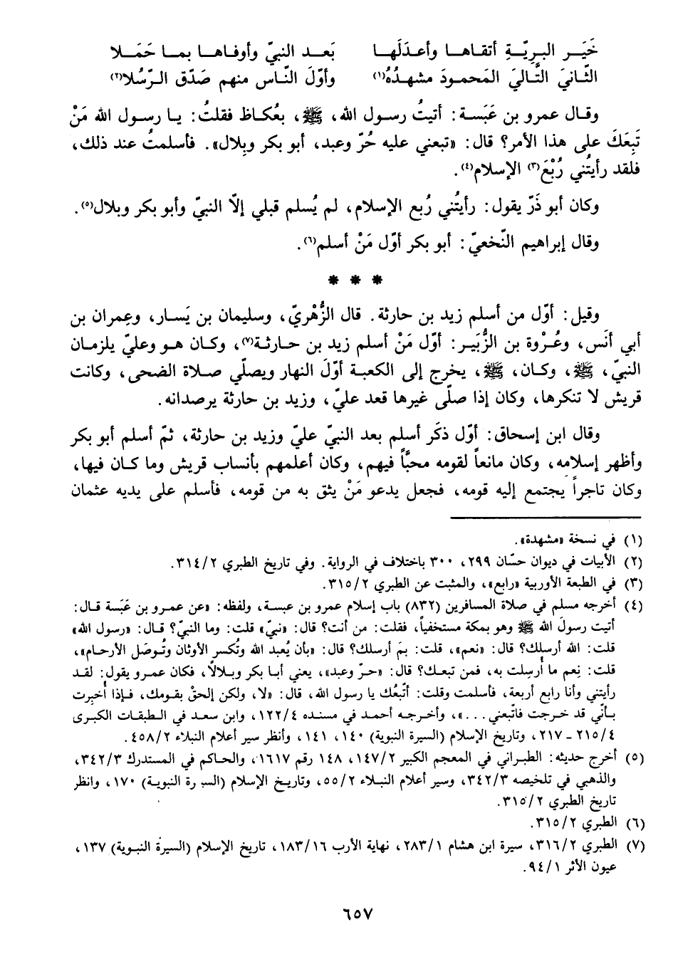 وَقَالَ عَمْرُو بْنُ عَبَسَةَ: أَتَيْتُ رَسُولَ اللَّهِ - صَلَّى اللَّهُ عَلَيْهِ وَسَلَّمَ - بِعُكَاظَ فَقُلْتُ: يَا رَسُولَ اللَّهِ مَنْ تَبِعَكَ عَلَى هَذَا الْأَمْرِ؟ قَالَ: تَبِعَنِي عَلَيْهِ حُرٌّ وَعَبْدٌ، أَبُو بَكْرٍ وَبِلَالٌ. فَأَسْلَمْتُ عِنْدَ ذَلِكَ، فَلَقَدْ رَأَيْتُنِي رُبُعَ الْإِسْلَامِ.