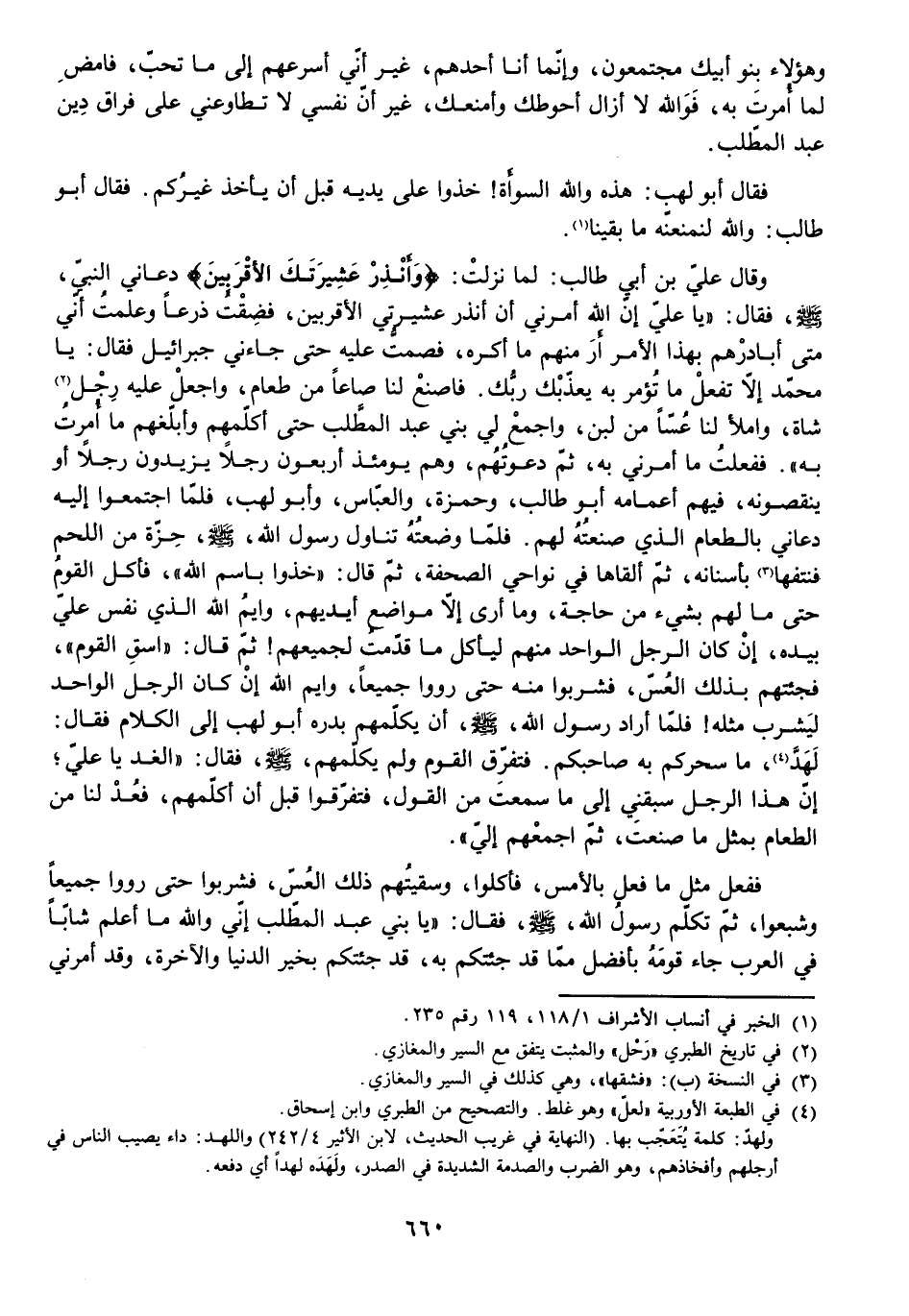 «وَقَالَ عَلِيُّ بْنُ أَبِي طَالِبٍ: لَمَّا نَزَلَتْ: {وَأَنْذِرْ عَشِيرَتَكَ الْأَقْرَبِينَ} [الشعراء: 214] دَعَانِي النَّبِيُّ - صَلَّى اللَّهُ عَلَيْهِ وَسَلَّمَ - فَقَالَ: " يَا عَلِيُّ إِنَّ اللَّهَ أَمَرَنِي أَنْ أُنْذِرَ عَشِيرَتِي الْأَقْرَبِينَ، فَضِقْتُ ذَرْعًا وَعَلِمْتُ أَنِّي مَتَى أُبَادِرُهُمْ بِهَذَا الْأَمْرِ أَرَ مِنْهُمْ مَا أَكْرَهُ، فَصَمَتُّ عَلَيْهِ حَتَّى جَاءَنِي جِبْرَائِيلُ فَقَالَ: يَا مُحَمَّدُ إِلَّا تَفْعَلْ مَا تُؤْمَرُ بِهِ يُعَذِّبْكَ رَبُّكَ. فَاصْنَعْ لَنَا صَاعًا مِنْ طَعَامٍ، وَاجْعَلْ عَلَيْهِ رِجْلَ شَاةٍ، وَامْلَأْ لَنَا عُسًّا مِنْ لَبَنٍ، وَاجْمَعْ لِي بَنِي عَبْدِ الْمُطَّلِبِ حَتَّى أُكَلِّمَهُمْ وَأُبَلِّغَهُمْ مَا أُمِرْتُ بِهِ. فَفَعَلْتُ مَا أَمَرَنِي بِهِ ثُمَّ دَعَوْتُهُمْ، وَهُمْ يَوْمَئِذٍ أَرْبَعُونَ رَجُلًا يَزِيدُونَ رَجُلًا أَوْ يَنْقُصُونَهُ، فِيهِمْ أَعْمَامُهُ أَبُو طَالِبٍ وَحَمْزَةُ وَالْعَبَّاسُ وَأَبُو لَهَبٍ، فَلَمَّا اجْتَمَعُوا إِلَيْهِ دَعَانِي بِالطَّعَامِ الَّذِي صَنَعْتُهُ لَهُمْ. فَلَمَّا وَضَعْتُهُ تَنَاوَلَ رَسُولُ اللَّهِ - صَلَّى اللَّهُ عَلَيْهِ وَسَلَّمَ - حُزَّةً مِنَ اللَّحْمِ فَنَتَفَهَا بِأَسْنَانِهِ ثُمَّ أَلْقَاهَا فِي نُوَاحِي الصَّحْفَةِ، ثُمَّ قَالَ: خُذُوا بِاسْمِ اللَّهِ، فَأَكَلَ الْقَوْمُ حَتَّى مَا لَهُمْ بِشَيْءٍ مِنْ حَاجَةٍ، وَمَا أَرَى إِلَّا مَوَاضِعَ أَيْدِيهِمْ، وَايْمُ اللَّهِ الَّذِي نَفْسُ عَلِيٍّ بِيَدِهِ إِنْ كَانَ الرَّجُلُ الْوَاحِدُ مِنْهُمْ لَيَأْكُلُ مَا قَدَّمْتُ لِجَمِيعِهِمْ! ثُمَّ قَالَ: " اسْقِ الْقَوْمَ "، فَجِئْتُهُمْ بِذَلِكَ الْعُسِّ فَشَرِبُوا مِنْهُ حَتَّى رَوَوْا جَمِيعًا، وَايْمُ اللَّهِ إِنْ كَانَ الرَّجُلُ الْوَاحِدُ لَيَشْرَبُ مِثْلَهُ! فَلَمَّا أَرَادَ رَسُولُ اللَّهِ - صَلَّى اللَّهُ عَلَيْهِ وَسَلَّمَ - أَنْ يُكَلِّمَهُمْ بَدَرَهُ أَبُو لَهَبٍ إِلَى الْكَلَامِ فَقَالَ: لَهَدَّ مَا سَحَرَكُمْ بِهِ صَاحِبُكُمْ. فَتَفَرَّقَ الْقَوْمُ وَلَمْ يُكَلِّمْهُمْ - صَلَّى اللَّهُ عَلَيْهِ وَسَلَّمَ - فَقَالَ: " الْغَدَ يَا عَلِيُّ، إِنَّ هَذَا الرَّجُلَ سَبَقَنِي إِلَى مَا سَمِعْتَ مِنَ الْقَوْلِ، فَتَفَرَّقُوا قَبْلَ أَنْ أُكَلِّمَهُمْ، فَعُدْ لَنَا مِنَ الطَّعَامِ بِمِثْلِ مَا صَنَعْتَ ثُمَّ اجْمَعْهُمْ إِلَيَّ ".