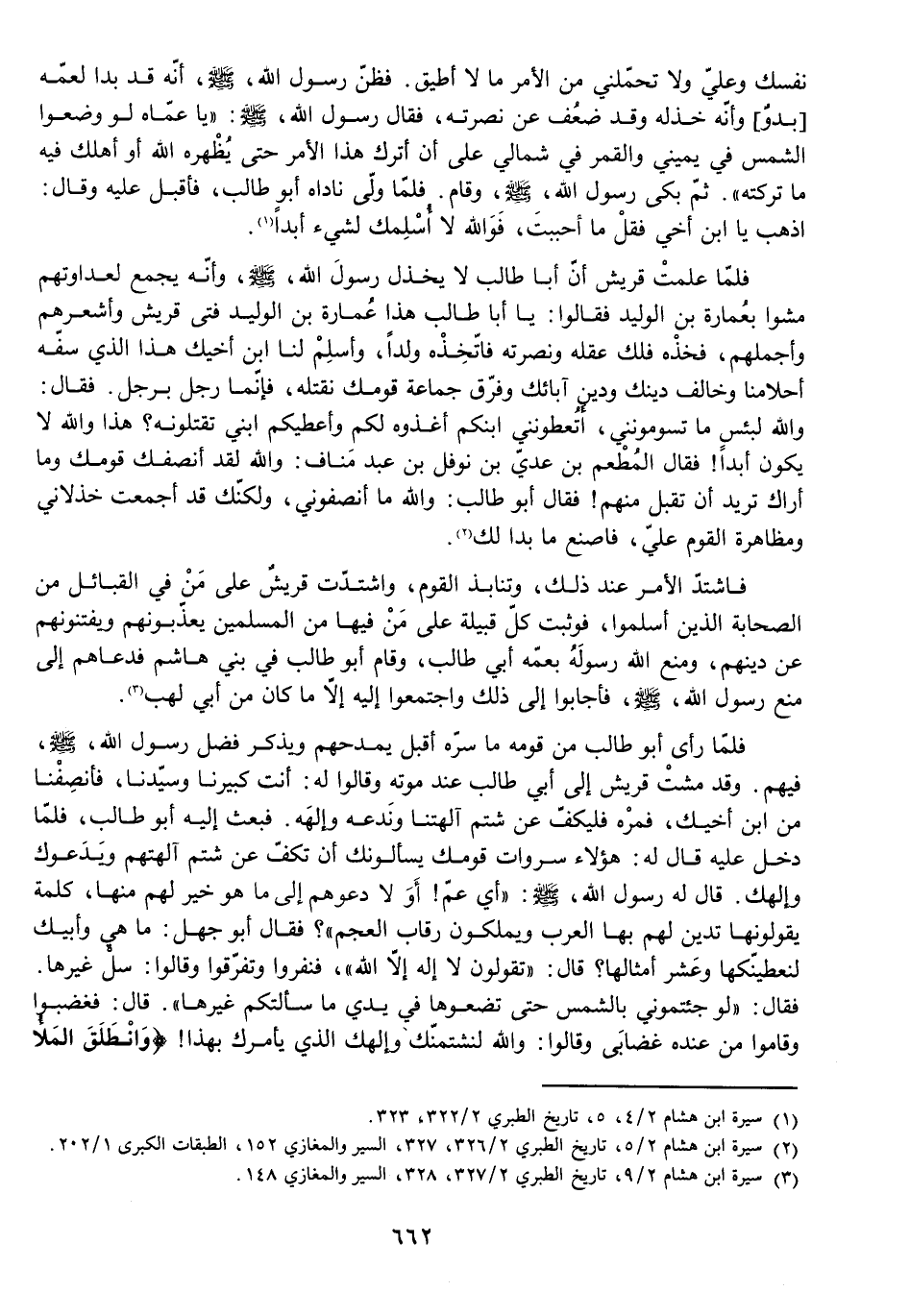 فَلَمَّا عَلِمَتْ قُرَيْشٌ أَنَّ أَبَا طَالِبٍ لَا يَخْذُلُ رَسُولَ اللَّهِ - صَلَّى اللَّهُ عَلَيْهِ وَسَلَّمَ - وَأَنَّهُ يَجْمَعُ لِعَدَاوَتِهِمْ، مَشَوْا بِعُمَارَةَ بْنِ الْوَلِيدِ فَقَالُوا: يَا أَبَا طَالِبٍ هَذَا عُمَارَةُ بْنُ الْوَلِيدِ فَتَى قُرَيْشٍ وَأَجْمَلُهُمْ، فَخُذْهُ فَلَكَ عَقْلُهُ وَنُصْرَتُهُ فَاتَّخِذْهُ وَلَدًا، وَأَسْلِمْ لَنَا ابْنَ أَخِيكَ هَذَا الَّذِي سَفَّهَ أَحْلَامَنَا، وَخَالَفَ دِينَكَ وَدِينَ آبَائِكَ، وَفَرَّقَ جَمَاعَةَ قَوْمِكَ نَقْتُلُهُ، فَإِنَّمَا رَجُلٌ بِرَجُلٍ. فَقَالَ: وَاللَّهِ لَبِئْسَ مَا تَسُومُونَنِي، أَتُعْطُونَنِي ابْنَكُمْ أَغْذُوهُ لَكُمْ وَأُعْطِيكُمُ ابْنِي تَقْتُلُونَهُ؟ هَذَا وَاللَّهِ لَا يَكُونُ أَبَدًا! فَقَالَ الْمُطْعِمُ بْنُ عَدِيِّ بْنِ نَوْفَلِ بْنِ عَبْدِ مَنَافٍ: وَاللَّهِ لَقَدْ أَنْصَفَكَ قَوْمُكَ، وَمَا أَرَاكَ تُرِيدُ أَنْ تَقْبَلَ مِنْهُمْ! فَقَالَ أَبُو طَالِبٍ: وَاللَّهِ مَا أَنْصَفُونِي، وَلَكِنَّكَ قَدْ أَجْمَعْتَ خِذْلَانِي وَمُظَاهَرَةَ الْقَوْمِ عَلَيَّ، فَاصْنَعْ مَا بَدَا لَكَ.