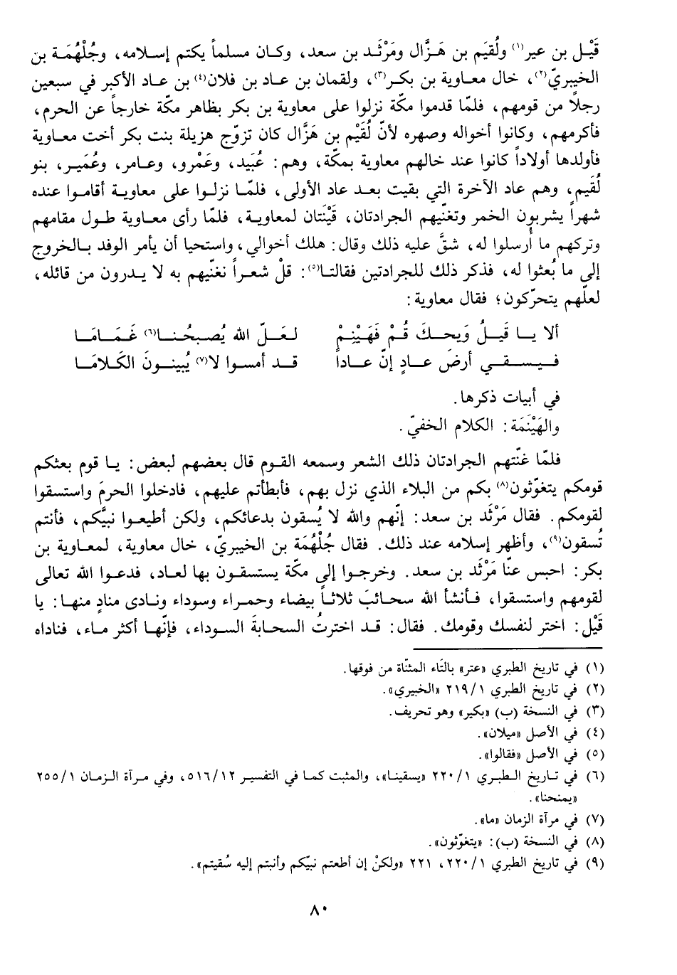 قَيْلَ بْنَ عِيرٍ، وَلُقَيْمَ بْنَ هَزَّالٍ، وَمَرْثَدَ بْنَ سَعْدٍ، وَكَانَ مُسْلِمًا يَكْتُمُ إِسْلَامَهُ، وَجَلْهَمَةَ بْنَ الْخَيْبَرِيِّ خَالَ مُعَاوِيَةَ بْنِ بَكْرٍ، وَلُقْمَانَ بْنَ عَادِ بْنِ فُلَانِ بْنِ عَادٍ الْأَكْبَرَ فِي سَبْعِينَ رَجُلًا مِنْ قَوْمِهِمْ، فَلَمَّا قَدِمُوا مَكَّةَ نَزَلُوا عَلَى مُعَاوِيَةَ بْنِ بَكْرٍ بِظَاهِرِ مَكَّةَ خَارِجًا عَنِ الْحَرَمِ، فَأَكْرَمَهُمْ، وَكَانُوا أَخْوَالَهُ وَصِهْرَهُ لِأَنَّ لُقَيْمَ بْنَ هَزَّالٍ كَانَ تَزَوَّجَ هُزَيْلَةَ بِنْتَ بَكْرٍ أُخْتَ مُعَاوِيَةَ، فَأَوْلَدَهَا أَوْلَادًا كَانُوا عِنْدَ خَالِهِمْ مُعَاوِيَةَ بِمَكَّةَ، وَهُمْ عُبَيْدٌ، وَعَمْرٌو، وَعَامِرٌ، وَعُمَيْرٌ بَنُو لُقَيْمٍ، وَهُوَ عَادٌ الْآخِرَةُ الَّتِي بَقِيَتْ بَعْدَ عَادٍ الْأُولَى، فَلَمَّا نَزَلُوا عَلَى مُعَاوِيَةَ أَقَامُوا عِنْدَهُ شَهْرًا يَشْرَبُونَ الْخَمْرَ وَتُغَنِّيهِمُ الْجَرَادَتَانِ - قَيْنَتَانِ لِمُعَاوِيَةَ - فَلَمَّا رَأَى مُعَاوِيَةُ طُولَ مُقَامِهِمْ وَتَرْكَهُمْ مَا أُرْسِلُوا لَهُ شَقَّ عَلَيْهِ ذَلِكَ، وَقَالَ: هَلَكَ أَخْوَالِي، وَاسْتَحْيَا أَنْ يَأْمُرَ الْوَفْدَ بِالْخُرُوجِ إِلَى مَا بُعِثُوا لَهُ، فَذَكَرَ ذَلِكَ لِلْجَرَادَتَيْنِ فَقَالَتَا: قُلْ شِعْرًا نُغَنِّيهِمْ بِهِ لَا يَدْرُونَ مَنْ قَائِلُهُ لَعَلَّهُمْ يَتَحَرَّكُونَ ; فَقَالَ مُعَاوِيَةُ: