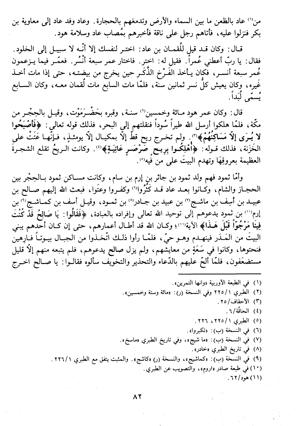 قَالَ: وَكَانَ قَدْ قِيلَ لِلُقْمَانَ بْنِ عَادٍ: اخْتَرْ لِنَفْسِكَ إِلَّا أَنَّهُ لَا سَبِيلَ إِلَى الْخُلُودِ. فَقَالَ: يَا رَبِّ أَعْطِنِي عُمُرًا. فَقِيلَ لَهُ: اخْتَرْ. فَاخْتَارَ عُمُرَ سَبْعَةِ أَنْسُرٍ. فَعُمِّرَ فِيمَا يَزْعُمُونَ عُمُرَ سَبْعَةِ أَنْسُرٍ، فَكَانَ يَأْخُذُ الْفَرْخَ الذَّكَرَ حِينَ يَخْرُجُ مِنْ بَيْضَتِهِ حَتَّى إِذَا مَاتَ أَخَذَ غَيْرَهُ، وَكَانَ يَعِيشُ كُلُّ نَسْرٍ ثَمَانِينَ سَنَةً، فَلَمَّا مَاتَ السَّابِعُ مَاتَ لُقْمَانُ مَعَهُ، وَكَانَ السَّابِعُ يُسَمَّى لُبَدًا. قَالَ: وَكَانَ عُمُرُ هُودٍ مِائَةً وَخَمْسِينَ سَنَةً. وَقَبْرُهُ بِحَضْرَمَوْتَ، وَقِيلَ بِالْحِجْرِ مِنْ مَكَّةَ، فَلَمَّا هَلَكُوا أَرْسَلَ اللَّهُ طَيْرًا سُودًا فَنَقَلَتْهُمْ إِلَى الْبَحْرِ، فَذَلِكَ قَوْلُهُ تَعَالَى: {فَأَصْبَحُوا لَا يُرَى إِلَّا مَسَاكِنُهُمْ} [الأحقاف: 25] . وَلَمْ تَخْرُجْ رِيحٌ قَطُّ إِلَّا بِمِكْيَالٍ إِلَّا يَوْمَئِذٍ فَإِنَّهَا عَتَتْ عَلَى الْخَزَنَةِ، فَذَلِكَ قَوْلُهُ {فَأُهْلِكُوا بِرِيحٍ صَرْصَرٍ عَاتِيَةٍ} [الحاقة: 6] . وَكَانَتِ الرِّيحُ تَقْلَعُ الشَّجَرَةَ الْعَظِيمَةَ بِعُرُوقِهَا وَتَهْدِمُ الْبَيْتَ عَلَى مَنْ فِيهِ.