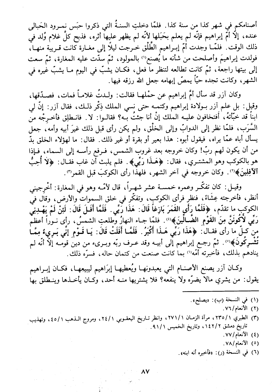أَصْنَامَكُمْ فِي شَهْرِ كَذَا مِنْ سَنَةِ كَذَا. فَلَمَّا دَخَلَتِ السَّنَةُ الَّتِي ذَكَرُوا حَبَسَ نُمْرُودُ الْحَبَالَى عِنْدَهُ إِلَّا أُمَّ إِبْرَاهِيمَ فَإِنَّهُ لَمْ يَعْلَمْ بِحَبَلِهَا لِأَنَّهُ لَمْ يَظْهَرْ عَلَيْهَا أَثَرُهُ، فَذَبَحَ كُلَّ غُلَامٍ وُلِدَ فِي ذَلِكَ الْوَقْتِ. فَلَمَّا وَجَدَتْ أُمُّ إِبْرَاهِيمَ الطَّلْقَ خَرَجَتْ لَيْلًا إِلَى مَغَارَةٍ كَانَتْ قَرِيبَةً مِنْهَا فَوَلَدَتْ إِبْرَاهِيمَ، وَأَصْلَحَتْ مِنْ شَأْنِهِ مَا يُصْنَعُ بِالْمَوْلُودِ، ثُمَّ سَدَّتْ عَلَيْهِ الْمَغَارَةَ، ثُمَّ سَعَتْ إِلَى بَيْتِهَا رَاجِعَةً، ثُمَّ كَانَتْ تُطَالِعُهُ لِتَنْظُرَ مَا فَعَلَ، فَكَانَ يَشِبُّ فِي الْيَوْمِ مَا يَشِبُّ غَيْرُهُ فِي الشَّهْرِ، وَكَانَتْ تَجِدُهُ حَيًّا يَمُصُّ إِبْهَامَهُ جَعَلَ اللَّهُ رِزْقَهُ فِيهَا.