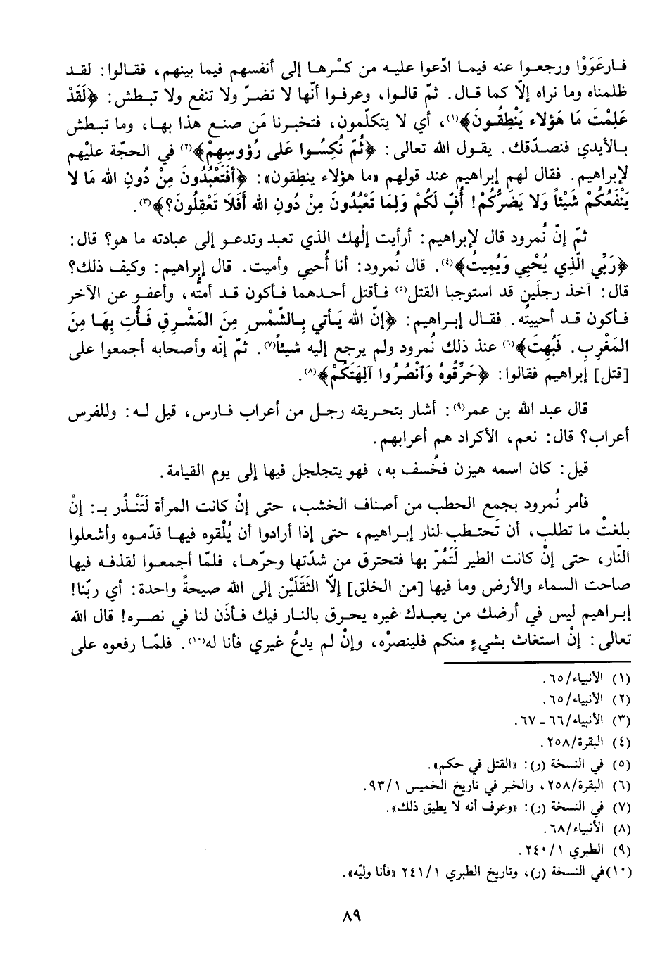 ثُمَّ إِنَّ نُمْرُودَ قَالَ لِإِبْرَاهِيمَ: أَرَأَيْتَ إِلَهَكَ الَّذِي تَعْبُدُ وَتَدْعُو إِلَى عِبَادَتِهِ مَا هُوَ؟ قَالَ: {رَبِّيَ الَّذِي يُحْيِي وَيُمِيتُ} [البقرة: 258] . قَالَ نُمْرُودُ: أَنَا أُحْيِي وَأُمِيتُ. قَالَ إِبْرَاهِيمُ: وَكَيْفَ ذَلِكَ؟ قَالَ: آخُذُ رَجُلَيْنِ قَدِ اسْتَوْجَبَا الْقَتْلَ فَأَقْتُلُ أَحَدَهُمَا فَأَكُونُ قَدْ أَمَتُّهُ، وَأَعْفُو عَنِ الْآخَرِ فَأَكُونُ قَدْ أَحْيَيْتُهُ. فَقَالَ إِبْرَاهِيمُ: {فَإِنَّ اللَّهَ يَأْتِي بِالشَّمْسِ مِنَ الْمَشْرِقِ فَأْتِ بِهَا مِنَ الْمَغْرِبِ فَبُهِتَ} [البقرة: 258] عِنْدَ ذَلِكَ نُمْرُودُ وَلَمْ يُرْجِعْ إِلَيْهِ شَيْئًا. ثُمَّ إِنَّهُ وَأَصْحَابَهُ أَجْمَعُوا عَلَى قَتْلِ إِبْرَاهِيمَ، فَقَالُوا: {حَرِّقُوهُ وَانْصُرُوا آلِهَتَكُمْ} [الأنبياء: 68]