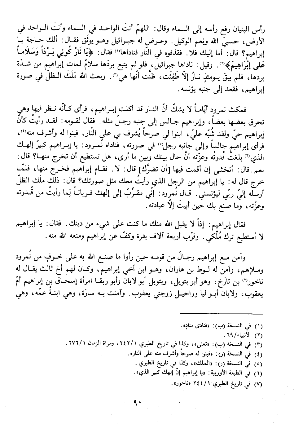 فَقَالَ إِبْرَاهِيمُ: إِذًا لَا يَقْبَلُ اللَّهُ مِنْكَ مَا كُنْتَ عَلَى شَيْءٍ مِنْ دِينِكَ. فَقَالَ: يَا إِبْرَاهِيمُ، لَا أَسْتَطِيعُ تَرْكَ مُلْكِي. وَقَرَّبَ أَرْبَعَةَ آلَافِ بَقَرَةٍ وَكَفَّ عَنْ إِبْرَاهِيمَ، وَمَنَعَهُ اللَّهُ مِنْهُ. وَآمَنَ مَعَ إِبْرَاهِيمَ رِجَالٌ مِنْ قَوْمِهِ حِينَ رَأَوْا مَا صَنَعَ اللَّهُ بِهِ عَلَى خَوْفٍ مِنْ نُمْرُودَ وَمَلَئِهِمْ، وَآمَنَ لَهُ لُوطُ بْنُ هَارَانَ، وَهُوَ ابْنُ أَخِي إِبْرَاهِيمَ، وَكَانَ لَهُمْ أَخٌ ثَالِثٌ يُقَالُ لَهُ نَاخُورُ بْنُ تَارِخَ، وَهُوَ أَبُو بِتْوِيلَ، وَبِتْوِيلُ أَبُو لَابَانَ وَأَبُو رَبْقَا امْرَأَةِ إِسْحَاقَ بْنِ إِبْرَاهِيمَ أُمِّ يَعْقُوبَ، وَلَابَانُ أَبُو لَيَّا وَرَاحِيلَ زَوْجَتَيْ يَعْقُوبَ. وَآمَنَتْ بِهِ سَارَةُ، وَهِيَ ابْنَةُ عَمِّهِ،