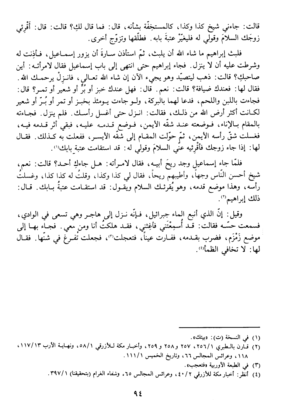 فَلَبِثَ إِبْرَاهِيمُ مَا شَاءَ اللَّهُ أَنْ يَلْبَثَ، ثُمَّ اسْتَأْذَنَ سَارَةَ أَنْ يَزُورَ إِسْمَاعِيلَ، فَأَذِنَتْ لَهُ وَشَرَطَتْ عَلَيْهِ أَنْ لَا يَنْزِلَ. فَجَاءَ إِبْرَاهِيمُ حَتَّى انْتَهَى إِلَى بَابِ إِسْمَاعِيلَ، فَقَالَ لِامْرَأَتِهِ أَيْنَ صَاحِبُكِ؟ قَالَتْ: ذَهَبَ لِيَتَصَيَّدَ وَهُوَ يَجِيءُ الْآنَ إِنْ شَاءَ اللَّهُ تَعَالَى، فَانْزِلْ يَرْحَمُكَ اللَّهُ. فَقَالَ لَهَا: فَعِنْدَكِ ضِيَافَةٌ؟ قَالَتْ: نَعَمْ. قَالَ: فَهَلْ عِنْدَكِ خُبْزٌ، أَوْ بُرٌّ، أَوْ شَعِيرٌ، أَوْ تَمْرٌ؟ قَالَ: فَجَاءَتْ بِاللَّبَنِ وَاللَّحْمِ، فَدَعَا لَهُمَا بِالْبَرَكَةِ، وَلَوْ جَاءَتْ يَوْمَئَذٍ بِخُبْزٍ، أَوْ تَمْرٍ، أَوْ بُرٍّ، أَوْ شَعِيرٍ لَكَانَتْ أَكْثَرَ أَرْضِ اللَّهِ مِنْ ذَلِكَ، فَقَالَتِ: انْزِلْ حَتَّى أَغْسِلَ رَأْسَكَ. فَلَمْ يَنْزِلْ. فَجَاءَتْهُ بِالْمَقَامِ بِالْإِنَاءِ فَوَضَعَتْهُ عِنْدَ شِقِّهِ الْأَيْمَنِ، فَوَضَعَ قَدَمَهُ عَلَيْهِ فَبَقِيَ أَثَرُ قَدَمِهِ فِيهِ، فَغَسَلَتْ شِقَّ رَأْسِهِ الْأَيْمَنَ، ثُمَّ حَوَّلَتِ الْمَقَامَ إِلَى شِقِّهِ الْأَيْسَرِ فَفَعَلَتْ بِهِ كَذَلِكَ. فَقَالَ لَهَا: إِذَا جَاءَ زَوْجُكِ فَأَقْرِئِيهِ عَنِّي السَّلَامَ وَقُولِي لَهُ: قَدِ اسْتَقَامَتْ عَتَبَةُ بَابِكَ.