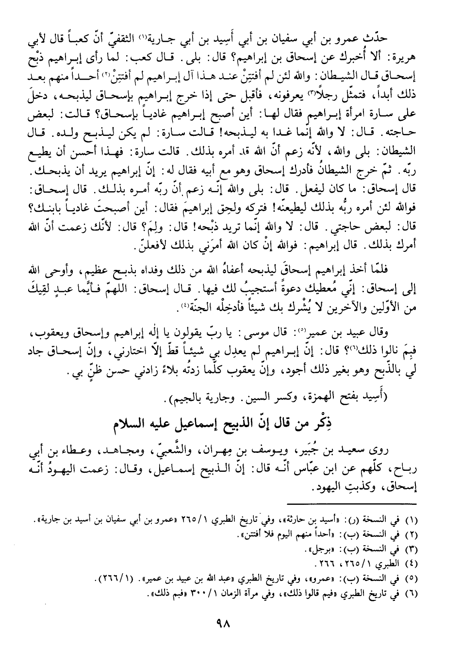 حَدَّثَ عَمْرُو بْنُ أَبِي سُفْيَانَ بْنِ أَبِي أَسِيدِ بْنِ أَبِي جَارِيَةَ الثَّقَفِيُّ أَنَّ كَعْبًا قَالَ لِأَبِي هُرَيْرَةَ: أَلَا أُخْبِرُكَ عَنْ إِسْحَاقَ بْنِ إِبْرَاهِيمَ؟ قَالَ: بَلَى. قَالَ كَعْبٌ: لَمَّا رَأَى إِبْرَاهِيمُ ذَبْحَ إِسْحَاقَ قَالَ الشَّيْطَانُ: وَاللَّهِ لَئِنْ لَمْ أَفْتَتِنْ أَحَدًا مِنْهُمْ بَعْدَ ذَلِكَ أَبَدًا، فَتَمَثَّلَ رَجُلًا يَعْرِفُونَهُ فَأَقْبَلَ حَتَّى إِذَا خَرَجَ إِبْرَاهِيمُ بِإِسْحَاقَ لِيَذْبَحَهُ دَخَلَ عَلَى سَارَةَ امْرَأَةِ إِبْرَاهِيمَ، فَقَالَ لَهَا: أَيْنَ أَصْبَحَ إِبْرَاهِيمُ غَادِيًا بِإِسْحَاقَ؟ قَالَتْ: لِبَعْضِ حَاجَتِهِ. قَالَ: لَا وَاللَّهِ إِنَّمَا غَدَا بِهِ لِيَذْبَحَهُ! قَالَتْ سَارَةُ: لَمْ يَكُنْ لِيَذْبَحَ وَلَدَهُ. قَالَ الشَّيْطَانُ: بَلَى وَاللَّهِ لِأَنَّهُ زَعَمَ أَنَّ اللَّهَ قَدْ أَمَرَهُ بِذَلِكَ. قَالَتْ سَارَةُ: فَهَذَا أَحْسَنُ أَنْ يُطِيعَ رَبَّهُ. ثُمَّ خَرَجَ الشَّيْطَانُ، فَأَدْرَكَ إِسْحَاقَ وَهُوَ مَعَ أَبِيهِ، فَقَالَ لَهُ: إِنَّ إِبْرَاهِيمَ يُرِيدُ أَنْ يَذْبَحَكَ. قَالَ إِسْحَاقُ: مَا كَانَ لِيَفْعَلَ. قَالَ: بَلَى وَاللَّهِ إِنَّهُ زَعَمَ أَنَّ رَبَّهُ أَمَرَ بِذَلِكَ. قَالَ إِسْحَاقُ: فَوَاللَّهِ لَئِنْ أَمَرَهُ رَبُّهُ بِذَلِكَ لَيُطِيعَنَّهُ! فَتَرَكَهُ وَلَحِقَ إِبْرَاهِيمَ، فَقَالَ: أَيْنَ أَصْبَحْتَ غَادِيًا بِابْنِكَ؟ قَالَ: لِبَعْضِ حَاجَتِي. قَالَ: لَا وَاللَّهِ إِنَّمَا تُرِيدُ ذَبْحَهُ! قَالَ: وَلِمَ؟ قَالَ: لِأَنَّكَ زَعَمْتَ أَنَّ اللَّهَ أَمَرَ بِذَلِكَ. قَالَ إِبْرَاهِيمُ: فَوَاللَّهِ إِنْ كَانَ اللَّهُ أَمَرَنِي بِذَلِكَ لَأَفْعَلَنَّ.