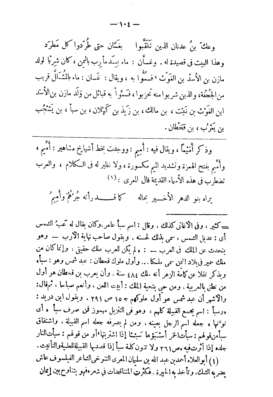 - كثير، وفى الأغانى كذلك، وقال: اسم سبأ عامر، وكان يقال له عب الشمس أى: عديل الشمس، سمى بذلك لحسنه. ويقول صاحب نهاية الأرب- وهو يتحدث عن الملك فى العرب-: «لم يكن للعرب ملك حقيقى، وإنما كان من ملك حمير فى بلاد اليمن سمى ملكا ... وأول ملوك قحطان: عبد شمس وهو: سبأ» ويذكر نقلا عن كمامة الزهر أنه ملك 484 سنة، وأن يعرب بن قحطان هو أول من نطق بالعربية، ومن حيى بتحية الملك: أبيت اللعن، وأنعم صباحا، ثم قال: والأشهر أن عبد شمس هو أول ملوكهم ج 15 ص 291. ويقول ابن دريد: «وسبأ: اسم يجمع القبيلة كلهم، وهو فى التنزيل مهموز فمن صرف سبأ «أى نوّنها» جعله اسم الرجل بعينه، ومن لم يصرفه جعله اسم القبيلة، واشتقاق سبأ من قولهم: سبأت الخمر أسبؤها سبئا إذا اشتريتها، أو من قولهم: سبأت النار جلده إذا أثرت فيه» ص 361 ولا تنون كلمة سبأ إذا قصد بها القبيلة للعلمية والتأنيث.