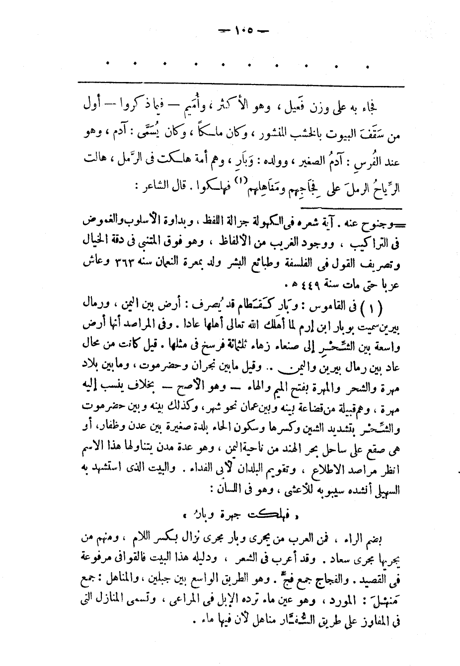 فَجَاءَ بِهِ عَلَى وَزْنِ فَعِيلٍ، وَهُوَ الْأَكْثَرُ، وَأُمَيْمٌ- فِيمَا ذَكَرُوا- أَوّلُ مَنْ سَقّفَ الْبُيُوتَ بِالْخَشْبِ الْمَنْشُورِ، وَكَانَ مَلِكًا، وَكَانَ يُسَمّى: آدَمَ، وَهُوَ عِنْدَ الْفُرْسِ: آدَمُ الصّغِيرُ، وَوَلَدُهُ: وَبَارٌ، وَهُمْ أُمّةٌ هَلَكَتْ فِي الرّمْلِ، هَالَتْ الرّيَاحُ الرّمْلَ عَلَى فِجَاجِهِمْ وَمَنَاهِلِهِمْ «1» فَهَلَكُوا. قَالَ الشّاعِرُ: