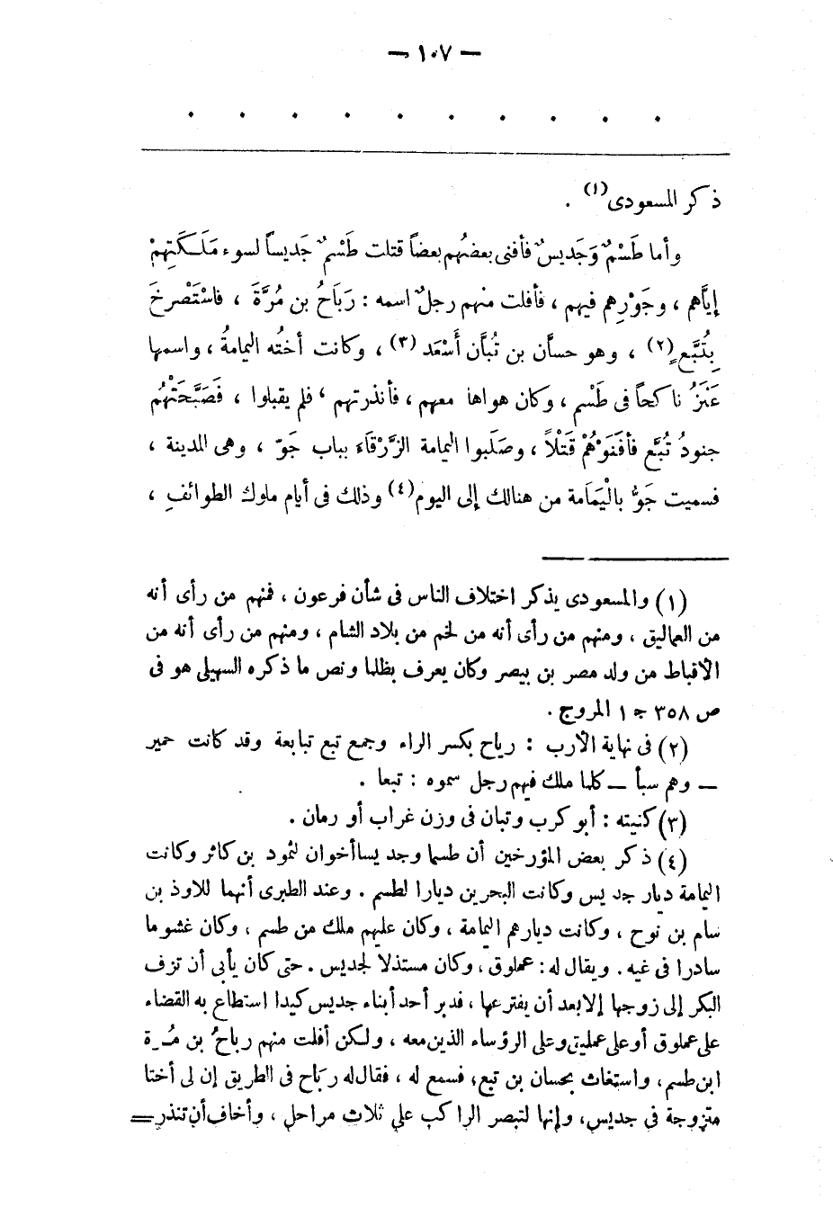 (4) ذكر بعض المؤرخين أن طسما وجد يسا أخوان لثمود بن كاثر وكانت اليمامة ديار جديس وكانت البحرين ديارا لطسم. وعند الطبرى أنهما للاوذ بن سأم بن نوح، وكانت ديارهم اليمامة، وكان عليهم ملك من طسم، وكان غشوما سادرا فى غيه. ويقال له: عملوق، وكان مستذلا لجديس. حتى كان يأبى أن تزف البكر إلى زوجها إلا بعد أن يفترعها، فدبر أحد أبناء جديس كيدا استطاع به القضاء على عملوق أو على عمليق وعلى الرؤساء الذين معه، ولكن أفلت منهم رباح بن مرة ابن طسم، واستغاث بحسان بن تبع، فسمع له، فقال له رباح فى الطريق إن لى أختا متزوجة فى جديس، وإنها لتبصر الراكب على ثلاث مراحل، وأخاف أن تنذر-