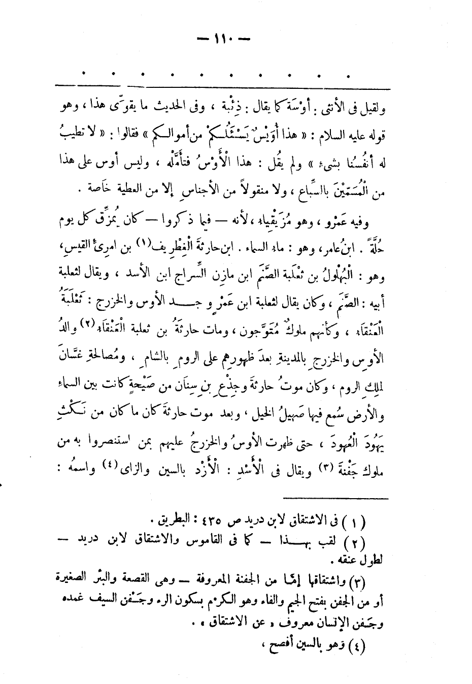 وَفِيهِ عَمْرٌو، وَهُوَ مُزَيْقِيَاءُ، لِأَنّهُ- فِيمَا ذَكَرُوا- كَانَ يُمَزّقُ كُلّ يَوْمٍ حُلّةً. ابْنُ عَامِرٍ، وَهُوَ: مَاءُ السّمَاءِ. ابْنُ حَارِثَةَ الْغِطْرِيفُ «1» بْنِ امْرِئِ القيس، وهو: البهلول بن ثعلبة الصّنم ابن مَازِنِ السّرَاجِ ابْنِ الْأَسَدِ، وَيُقَالُ لِثَعْلَبَةَ أَبِيهِ: الصّنم، وكان يقال لثعلبة ابن عمر وجد الْأَوْسِ وَالْخَزْرَجِ: ثَعْلَبَةُ الْعَنْقَاءُ، وَكَأَنّهُمْ مُلُوكٌ مُتَوَجّونَ، وَمَاتَ حَارِثَةُ بْنُ ثَعْلَبَةَ الْعَنْقَاءُ «2» وَالِدُ الْأَوْسِ وَالْخَزْرَجِ بِالْمَدِينَةِ بَعْدَ ظُهُورِهِمْ عَلَى الرّومِ بِالشّامِ، وَمُصَالَحَةِ غَسّانَ لِمَلِكِ الرّومِ، وَكَانَ مَوْتُ حَارِثَةَ وَجِذْعِ بْنِ سِنَانٍ مِنْ صَيْحَةٍ كَانَتْ بَيْنَ السماء والأرض سمع فيها صَهِيلَ الْخَيْلِ، وَبَعْدَ مَوْتِ حَارِثَةَ كَانَ مَا كَانَ مِنْ نَكْثِ يَهُودِ الْعُهُودِ، حَتّى ظَهَرَتْ الْأَوْسُ وَالْخَزْرَجُ عَلَيْهِمْ بِمَنْ اسْتَنْصَرُوا بِهِ مِنْ مُلُوكِ جَفْنَةَ «3» وَيُقَالُ فِي الْأَسْدِ: الْأَزْدُ بِالسّينِ والزاى «4» واسمه: