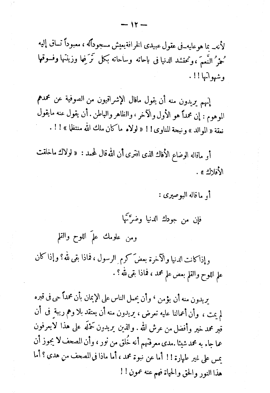 يريدون منه أن يؤمن، وأن يحمل الناس على الإيمان بأن محمدا حى فى قبره لم يمت، وأن أعمالنا عليه تعرض، يريدون منه أن يعتقد بلا وهم ريبة فى أن قبر محمد خير وأفضل من عرش الله. والذين يريدون حمله على هذا لا يعرفون عما جاء به محمد شيئا. مدى معرفتهم أنه خلق من نور، وأن المصحف لا يجوز أن يمس على غير طهارة!! أما عن نبوة محمد، أما ماذا فى المصحف من هدى؟ أما هذا النور والحق والحياة فهم عنه عمون!!