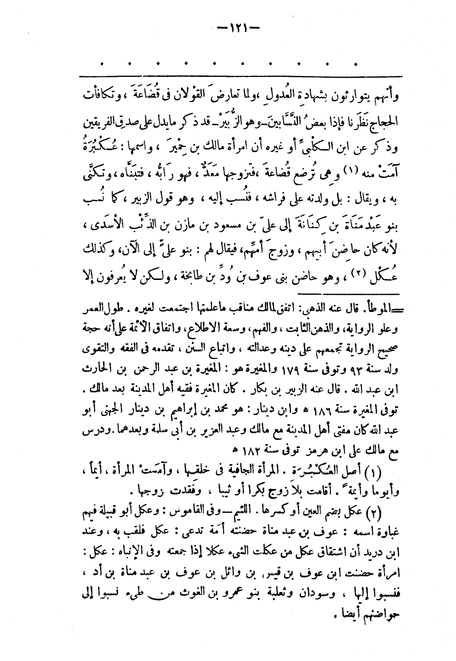 وَأَنّهُمْ يَتَوَارَثُونَ بِشَهَادَةِ الْعُدُولِ، وَلَمّا تَعَارَضَ الْقَوْلَانِ فِي قُضَاعَةَ، وَتَكَافَأَتْ الْحِجَاجُ نَظَرْنَا فَإِذَا بَعْضُ النّسّابِينَ- وَهُوَ الزّبَيْرُ- قَدْ ذَكَرَ مَا يَدُلّ عَلَى صِدْقِ الْفَرِيقَيْنِ وَذَكَرَ عَنْ ابْنِ الْكَلْبِيّ أَوْ غَيْرِهِ أَنّ امْرَأَةَ مَالِكِ بْنِ حِمْيَرَ، واسْمُهَا: عُكْبُرَةُ آمَتْ مِنْهُ «1» وَهِيَ تُرْضِعُ قُضَاعَةَ، فَتَزَوّجَهَا مَعَدّ، فَهُوَ رَابّهُ، فَتَبَنّاهُ، وَتُكَنّى بِهِ، وَيُقَالُ: بَلْ وَلَدَتْهُ عَلَى فِرَاشِهِ، فَنُسِبَ إلَيْهِ، وَهُوَ قَوْلُ الزّبَيْرِ، كَمَا نُسِبَ بَنُو عَبْدِ مَنَاةَ بْنِ كِنَانَةَ إلَى عَلِيّ بْنِ مَسْعُودِ بْنِ مَازِنِ بْنِ الذّئْبِ الْأَسَدِيّ، لِأَنّهُ كَانَ حَاضِنَ أَبِيهِمْ، وَزَوْجَ أُمّهِمْ، فَيُقَالُ لَهُمْ: بَنُو عَلِيّ إلَى الْآنِ، وَكَذَلِكَ عُكْلٌ «2» ، وَهُوَ حَاضِنُ بَنِي عَوْفِ بْنِ وُدّ بْنِ طَابِخَةَ، وَلَكِنْ لا يعرفون إلا