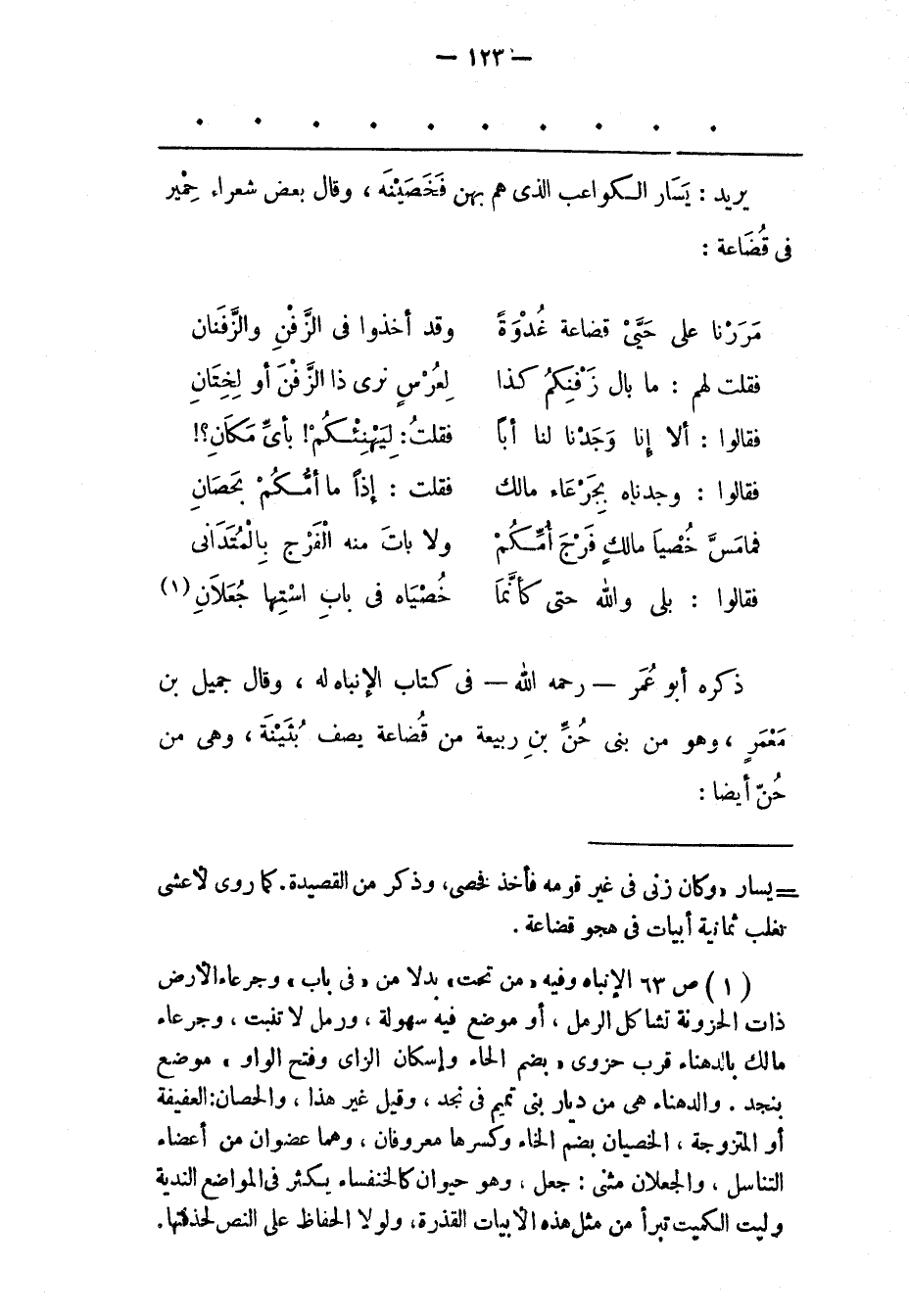 (1) ص 63 الإنباه وفيه «من تحت» بدلا من «فى باب» وجرعاء الأرض ذات الحزونة تشاكل الرمل، أو موضع فيه سهولة، ورمل لا تنبت، وجرعاء مالك بالدهناء قرب حزوى «بضم الحاء وإسكان الزاى وفتح الواو» موضع بنجد. والدهناء هى من ديار بنى تميم فى نجد، وقيل غير هذا، والحصان: العفيفة أو المتزوجة، الخصيان بضم الخاء وكسرها معروفان، وهما عضوان من أعضاء التناسل، والجعلان مثنى: جعل، وهو حيوان كالخنفساء يكثر فى المواضع الندية وليت الكميت تبرأ من مثل هذه الأبيات القذرة، ولولا الحفاظ على النص لحذفتها.