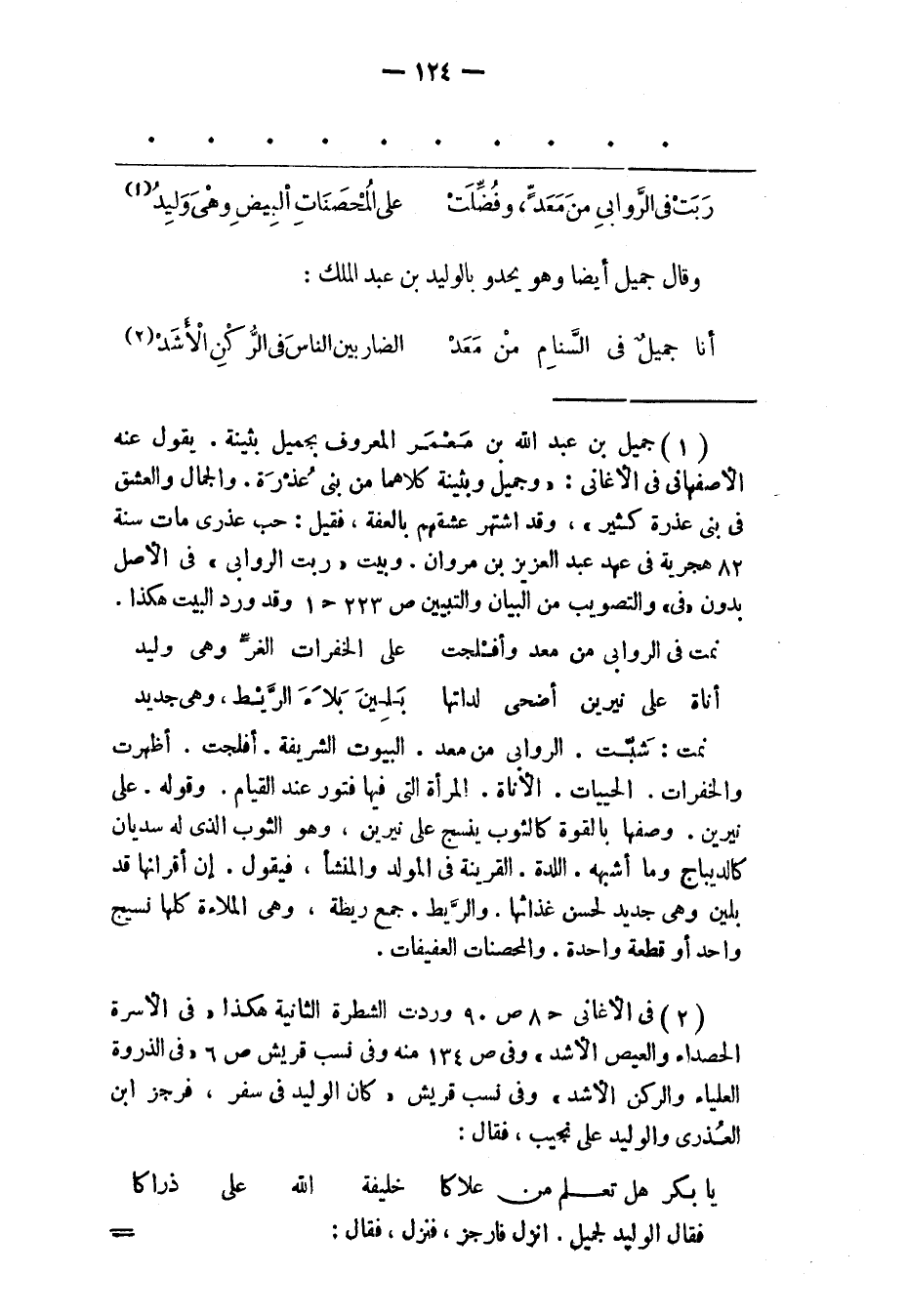 (1) جميل بن عبد الله بن معمر المعروف بجميل بثينة. يقول عنه الأصفهانى فى الأغانى: «وجميل وبثينة كلاهما من بنى عذرة. والجمال والعشق فى بنى عذرة كثير» ، وقد اشتهر عشقهم بالعفة، فقيل: حب عذرى مات سنة 82 هجرية فى عهد عبد العزيز بن مروان. وبيت «ربت الروابى» فى الأصل بدون «فى» والتصويب من البيان والتبيين ص 223 ح 1 وقد ورد البيت هكذا.