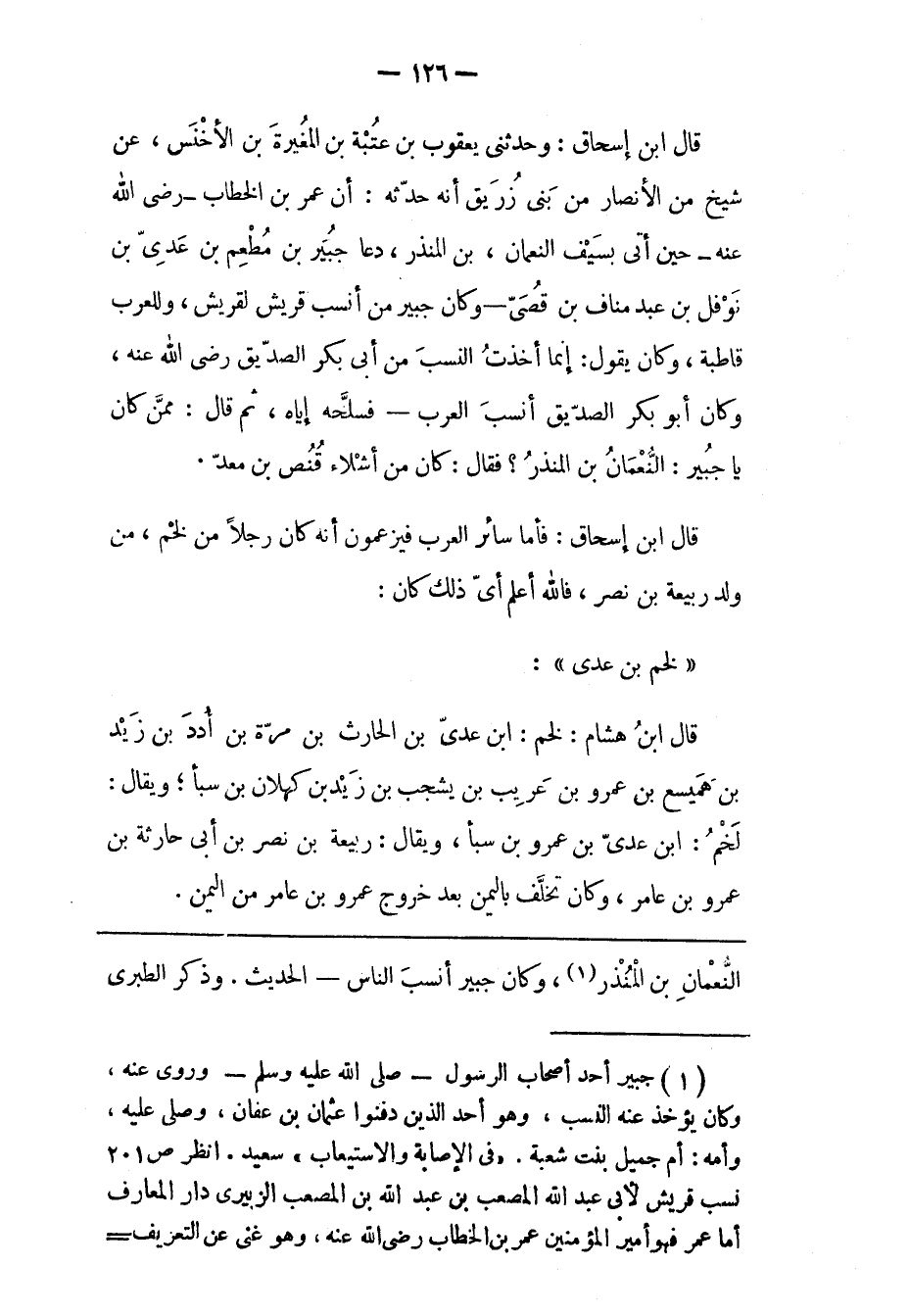 النّعْمَانِ بْنِ الْمُنْذِرِ «1» ، وَكَانَ جُبَيْرٌ أَنْسَبَ النّاسِ- الحديث. وذكر الطبرى