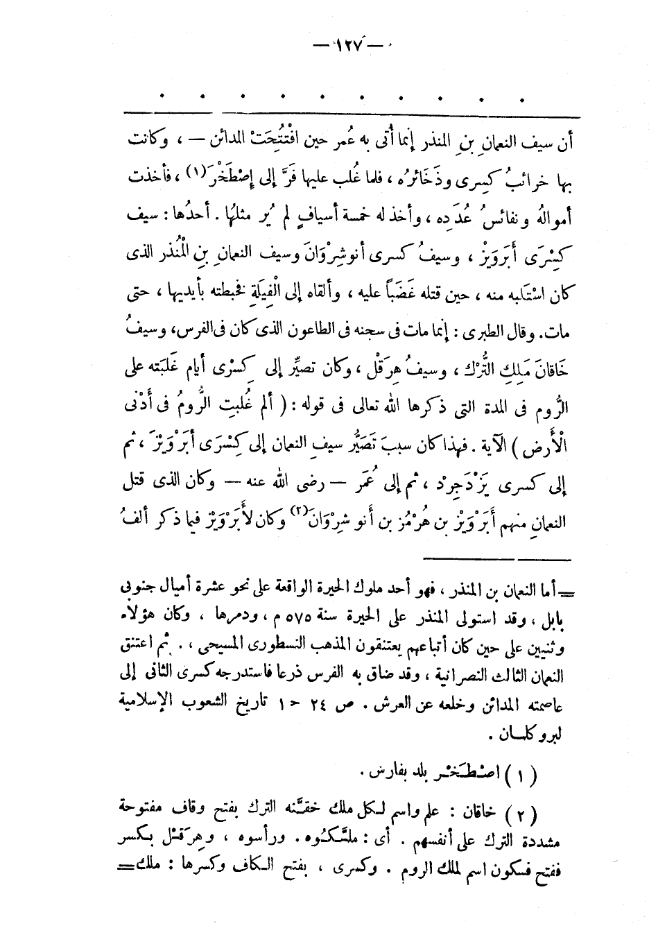 أَنّ سَيْفَ النّعْمَانِ بْنِ الْمُنْذِرِ إنّمَا أُتِيَ بِهِ عُمَرَ حِينَ اُفْتُتِحَتْ الْمَدَائِنُ-، وَكَانَتْ بِهَا خَرَائِبُ كِسْرَى وَذَخَائِرُهُ، فَلَمّا غُلِبَ عَلَيْهَا فَرّ إلَى إصْطَخْرَ «1» ، فَأَخَذَتْ أَمْوَالَهُ وَنَفَائِسَ عُدَدِهِ، وَأَخَذَ لَهُ خَمْسَةَ أَسْيَافٍ لَمْ يُرَ مِثْلُهَا. أَحَدُهَا: سَيْفُ كِسْرَى أبرويز، وَسَيْفُ كِسْرَى أَنُوشِرْوَانَ وَسَيْفُ النّعْمَانِ بْنِ الْمُنْذِرِ الّذِي كَانَ اسْتَلَبَهُ مِنْهُ، حِينَ قَتَلَهُ غَضَبًا عَلَيْهِ، وَأَلْقَاهُ إلَى الْفِيَلَةِ فَخَبَطَتْهُ بِأَيْدِيهَا، حَتّى مَاتَ. وَقَالَ الطّبَرِيّ: إنّمَا مَاتَ فِي سِجْنِهِ فِي الطّاعُونِ الّذِي كَانَ فِي الْفُرْسِ، وَسَيْفُ خَاقَانَ مَلِكِ التّرْكِ، وَسَيْفِ هِرَقْلَ، وَكَانَ تَصَيّرَ إلَى كِسْرَى أَيّامَ غَلَبَتِهِ عَلَى الرّومِ فِي الْمُدّةِ الّتِي ذَكَرَهَا اللهُ تَعَالَى فِي قَوْلِهِ: (الم غُلِبَتِ الرُّومُ فِي أَدْنَى الْأَرْضِ) الْآيَةَ. فَهَذَا كَانَ سَبَبُ تَصَيّرِ سَيْفِ النّعْمَانِ إلَى كِسْرَى أبرويز، ثُمّ إلَى كِسْرَى يَزْدَجْرِدْ، ثُمّ إلَى عُمَرَ- رَضِيَ اللهُ عَنْهُ- وَكَانَ الّذِي قَتَلَ النّعْمَانَ مِنْهُمْ أبرويز بْنُ هُرْمُزَ بْنِ أَنُوشِرْوَانَ «2» وَكَانَ لأبرويز فِيمَا ذُكِرَ أَلْفُ