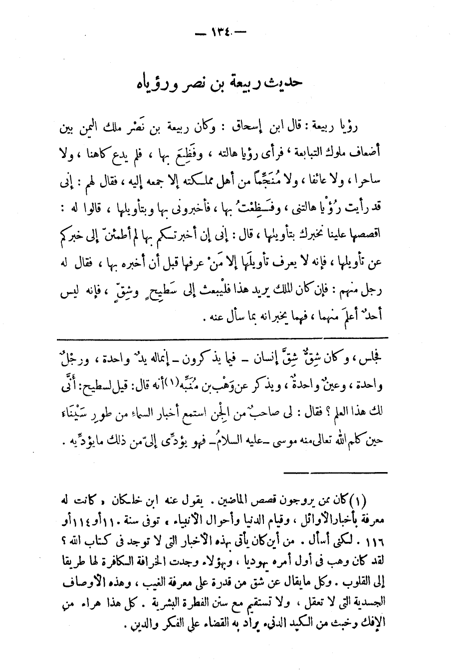 قَالَ ابْنُ إسْحَاقَ: وَكَانَ رَبِيعَةُ بْنُ نَصْرٍ مَلِكُ الْيَمَنِ بَيْنَ أَضْعَافِ مُلُوكِ التّبَابِعَةِ، فَرَأَى رُؤْيَا هَالَتْهُ، وَفَظِعَ بِهَا، فَلَمْ يَدَعْ كَاهِنًا، وَلَا سَاحِرًا، وَلَا عَائِفًا، وَلَا مُنَجّمًا مِنْ أَهْلِ مَمْلَكَتِهِ إلّا جَمَعَهُ إلَيْهِ، فَقَالَ لَهُمْ: إنّي قَدْ رَأَيْت رُؤْيَا هَالَتْنِي، وَفَظِعْتُ بِهَا، فَأَخْبِرُونِي بِهَا وَبِتَأْوِيلِهَا، قَالُوا لَهُ: