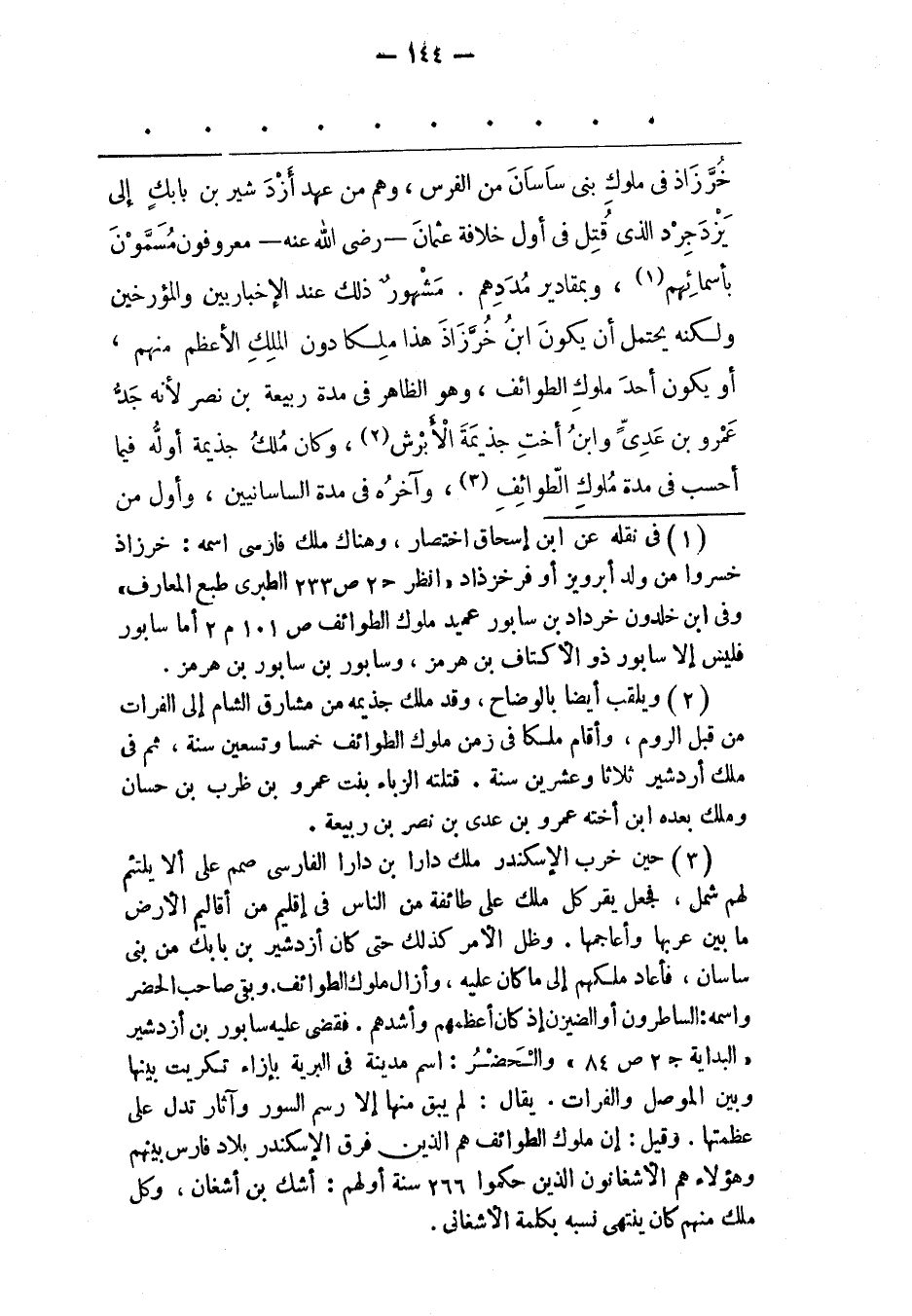(3) حين خرب الإسكندر ملك دارا بن دارا الفارسى صمم على ألا يلتئم لهم شمل، فجعل يقر كل ملك على طائفة من الناس فى إقليم من أقاليم الأرض ما بين عربها وأعاجمها. وظل الأمر كذلك حتى كان أزدشير بن بابك من بنى ساسان، فأعاد ملكهم إلى ما كان عليه، وأزال ملوك الطوائف. وبقى صاحب الحضر واسمه: الساطرون أو الضيزن إذ كان أعظمهم وأشدهم. فقضى عليه سابور بن أزدشير «البداية ج 2 ص 84» والحضر: اسم مدينة فى البرية بإزاء تكريت بينها وبين الموصل والفرات. يقال: لم يبق منها إلا رسم السور وآثار تدل على عظمتها. وقيل: إن ملوك الطوائف هم الذين فرق الإسكندر بلاد فارس بينهم وهؤلاء هم الأشغانون الذين حكموا 266 سنة أولهم: أشك بن أشغان، وكل ملك منهم كان ينتهى نسبه بكلمة الأشغانى.