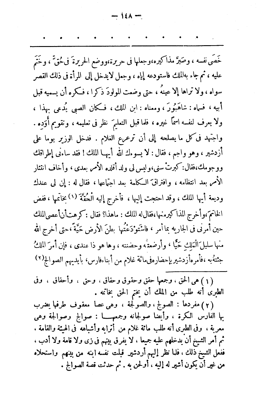 وَاجْتَهَدَ فِي كُلّ مَا يُصْلِحُهُ إلَى أَنْ ترعرع الغلام. فدخل الوزير يوما على أردشير، وَهُوَ وَاجِمٌ، فَقَالَ: لَا يَسُوءُك اللهُ أَيّهَا الْمَلِكُ! فَقَدْ سَاءَنِي إطْرَاقُك وَوُجُومُك، فَقَالَ: كَبِرَتْ سِنّي، وَلَيْسَ لِي وَلَدٌ أُقَلّدُهُ الْأَمْرَ بَعْدِي، وَأَخَافُ انْتِثَارَ الْأَمْرِ بَعْدَ انْتِظَامِهِ، وَافْتِرَاقَ الْكَلِمَةِ بَعْدَ اجْتِمَاعِهَا، فَقَالَ لَهُ: إنّ لِي عِنْدَك وَدِيعَةً أَيّهَا الْمَلِكُ، وَقَدْ احْتَجْت إلَيْهَا، فَأَخْرَجَ إلَيْهِ الْحُقّةَ «1» بِخَاتَمِهَا، فَفَضّ الْخَاتَمَ، وَأَخْرَجَ الْمَذَاكِيرَ مِنْهَا، فَقَالَ لَهُ الْمَلِكُ: مَا هَذَا؟ فَقَالَ: كَرِهْت أَنْ أَعْصِيَ الْمَلِكَ حِينَ أَمَرَنِي فِي الْجَارِيَةِ بِمَا أَمَرَ، فَاسْتَوْدَعْتهَا بَطْنَ الْأَرْضِ حَيّةً، حَتّى أَخْرَجَ اللهُ مِنْهَا سَلِيلَ الْمَلِكِ حَيّا، وَأَرْضَعَتْهُ وَحَضَنَتْهُ، وَهَا هُوَ ذَا عِنْدِي، فَإِنْ أَمَرَ الْمَلِكُ جِئْته بِهِ، فَأَمَرَهُ أَزْدَشِيرُ بِإِحْضَارِهِ فِي مِائَةِ غُلَامٍ مِنْ أَبْنَاءِ فَارِسَ، بِأَيْدِيهِمْ الصوالج «2»
