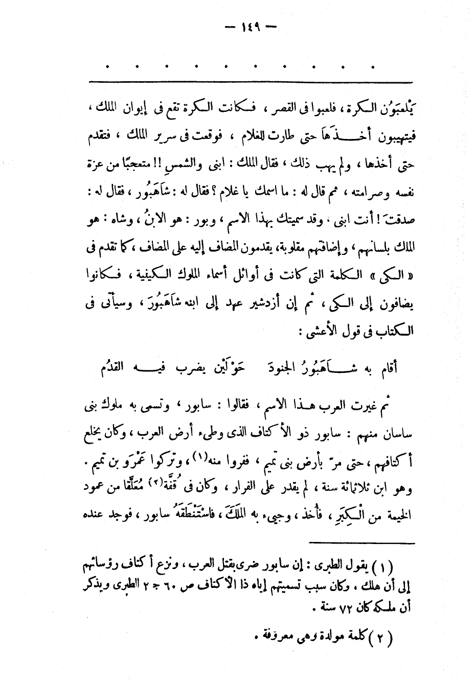 (1) يقول الطبرى: إن سابور ضرى بقتل العرب، ونزع أكتاف رؤسائهم إلى أن هلك، وكان سبب تسميتهم إياه ذا الأكتاف ص 60 ج 2 الطبرى ويذكر أن ملكه كان 72 سنة.