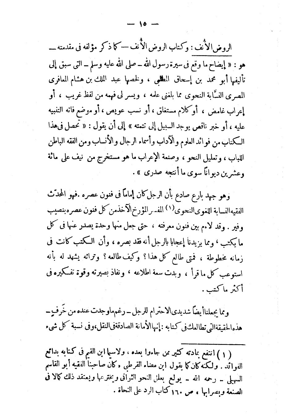 الروض الأنف: وكتاب الروض الأنف- كما ذكر مؤلفه فى مقدمته- هو: «إيضَاحِ مَا وَقَعَ فِي سِيرَةِ رَسُولِ اللهِ- صَلّى اللهُ عَلَيْهِ وَسَلّمَ- الّتِي سَبَقَ إلَى تأليفها أبو مُحَمّدُ بْنُ إسْحَاقَ الْمُطّلِبِيّ، وَلَخَصّهَا عَبْدُ الْمَلِكِ بْنُ هِشَامٍ الْمَعَافِرِيّ الْمِصْرِيّ النّسّابَةُ النّحْوِيّ مِمّا بَلَغَنِي عِلْمُهُ، وَيُسّرَ لِي فَهْمُهُ مِنْ لَفْظٍ غَرِيبٍ، أَوْ إعْرَابٍ غَامِضٍ، أَوْ كَلَامٍ مُسْتَغْلِقٍ، أو نسب عويص، أو موضع فاته التّنْبِيهُ عَلَيْهِ، أَوْ خَبَرٍ نَاقِصٍ يُوجَدُ السّبِيلُ إلى تتمته» إلى أن يقول: «تَحَصّلَ فِي هَذَا الْكِتَابِ مِنْ فَوَائِدِ الْعُلُومِ وَالْآدَابِ وَأَسْمَاءِ الرّجَالِ وَالْأَنْسَابِ وَمِنْ الْفِقْهِ الْبَاطِنِ اللّبَابِ، وَتَعْلِيلِ النّحْوِ، وَصَنْعَةِ الْإِعْرَابِ مَا هُوَ مُسْتَخْرَجٌ مِنْ نَيّفٍ عَلَى مِائَةٍ وَعِشْرِينَ دِيوَانًا سوى ما أنتجه صدرى» .