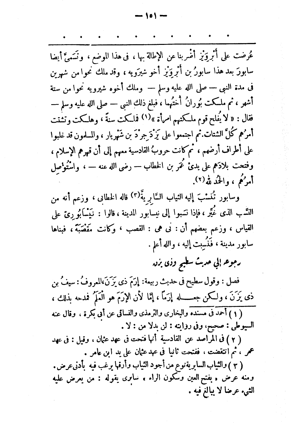 عُرِضَتْ عَلَى أبرويز أَضْرَبْنَا عَنْ الْإِطَالَةِ بِهَا، فِي هَذَا الْمَوْضِعِ، وَتَسَمّى أَيْضًا سَابُورُ بَعْدَ هَذَا سَابُورُ بْنِ أبرويز أَخُو شِيرَوَيْه، وَقَدْ مَلَكَ نَحْوًا مِنْ شَهْرَيْنِ فِي مُدّةِ النّبِيّ- صَلَّى اللَّهُ عَلَيْهِ وَسَلَّمَ- وَمَلَكَ أَخُوهُ شِيرَوَيْه نَحْوًا مِنْ سِتّةِ أَشْهُرٍ، ثُمّ مَلَكَتْ بُورَانُ أُخْتُهُمَا، فَبَلَغَ ذَلِكَ النّبِيّ- صَلَّى اللَّهُ عَلَيْهِ وَسَلَّمَ- فَقَالَ: «لَا يُفْلِحُ قَوْمٌ مَلَكَتْهُمْ امْرَأَةٌ» «1» فَمَلَكَتْ سَنَةً، وَهَلَكَتْ وَتَشَتّتَ أَمْرُهُمْ كُلّ الشّتَاتِ. ثُمّ اجْتَمَعُوا عَلَى يَزْدَجْرِدْ بْنِ شَهْرَيَارَ، وَالْمُسْلِمُونَ قَدْ غَلَبُوا عَلَى أَطْرَافِ أَرْضِهِمْ، ثُمّ كَانَتْ حُرُوبُ الْقَادِسِيّةِ مَعَهُمْ إلَى أَنْ قَهَرَهُمْ الْإِسْلَامُ، وَفُتِحَتْ بِلَادُهُمْ عَلَى يَدَيْ عُمَرَ بْنِ الْخَطّابِ- رَضِيَ اللهُ عَنْهُ-، وَاسْتُؤْصِلَ أَمْرُهُمْ، وَالْحَمْدُ لِلّهِ «2» .