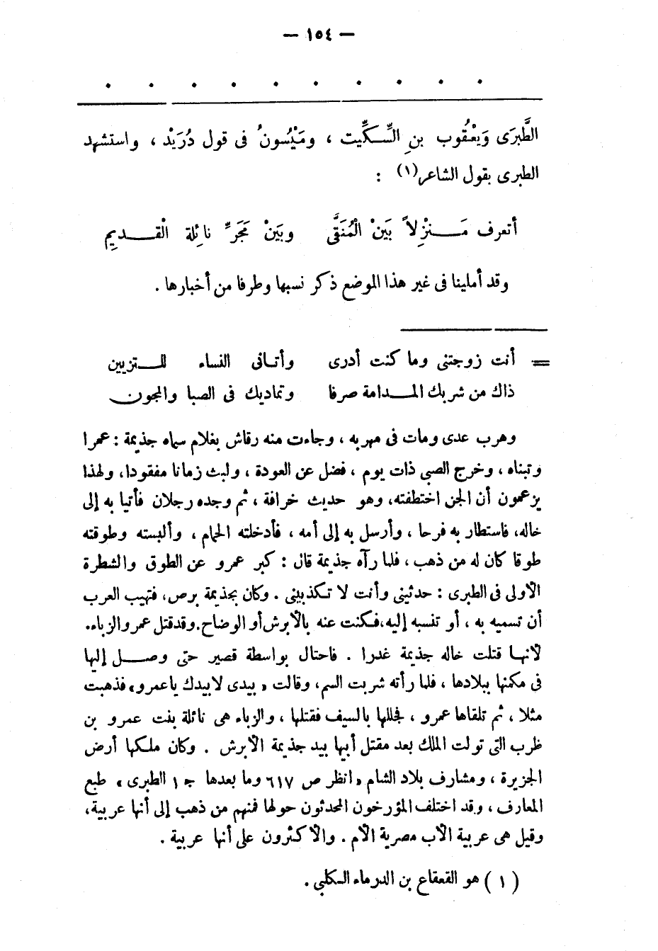 وهرب عدى ومات فى مهربه، وجاءت منه رقاش بغلام سماه جذيمة: عمرا وتبناه، وخرج الصبى ذات يوم، فضل عن العودة، ولبث زمانا مفقودا، ولهذا يزعمون أن الجن اختطفته، وهو حديث خرافة، ثم وجده رجلان فأتيا به إلى خاله، فاستطار به فرحا، وأرسل به إلى أمه، فأدخلته الحمام، وألبسته وطوقته طوقا كان له من ذهب، فلما رآه جذيمة قال: كبر عمرو عن الطوق والشطرة الأولى فى الطبرى: حدثينى وأنت لا تكذبينى. وكان بجذيمة برص، فتهيب العرب أن تسميه به، أو تنسبه إليه، فكنت عنه بالأبرش أو الوضاح. وقد قتل عمرو الزباء. لأنها قتلت خاله جذيمة غدرا. فاحتال بواسطة قصير حتى وصل إليها فى مكمنها ببلادها، فلما رأته شربت السم، وقالت «بيدى لا بيدك يا عمرو» فذهبت مثلا، ثم تلقاها عمرو، فجللها بالسيف فقتلها، والزباء هى نائلة بنت عمرو بن ظرب التى تولت الملك بعد مقتل أبيها بيد جذيمة الأبرش. وكان ملكها أرض الجزيرة، ومشارف بلاد الشام «انظر ص 617 وما بعدها ج 1 الطبرى» طبع المعارف، وقد اختلف المؤرخون المحدثون حولها فمنهم من ذهب إلى أنها عربية، وقيل هى عربية الأب مصرية الأم. والأكثرون على أنها عربية.