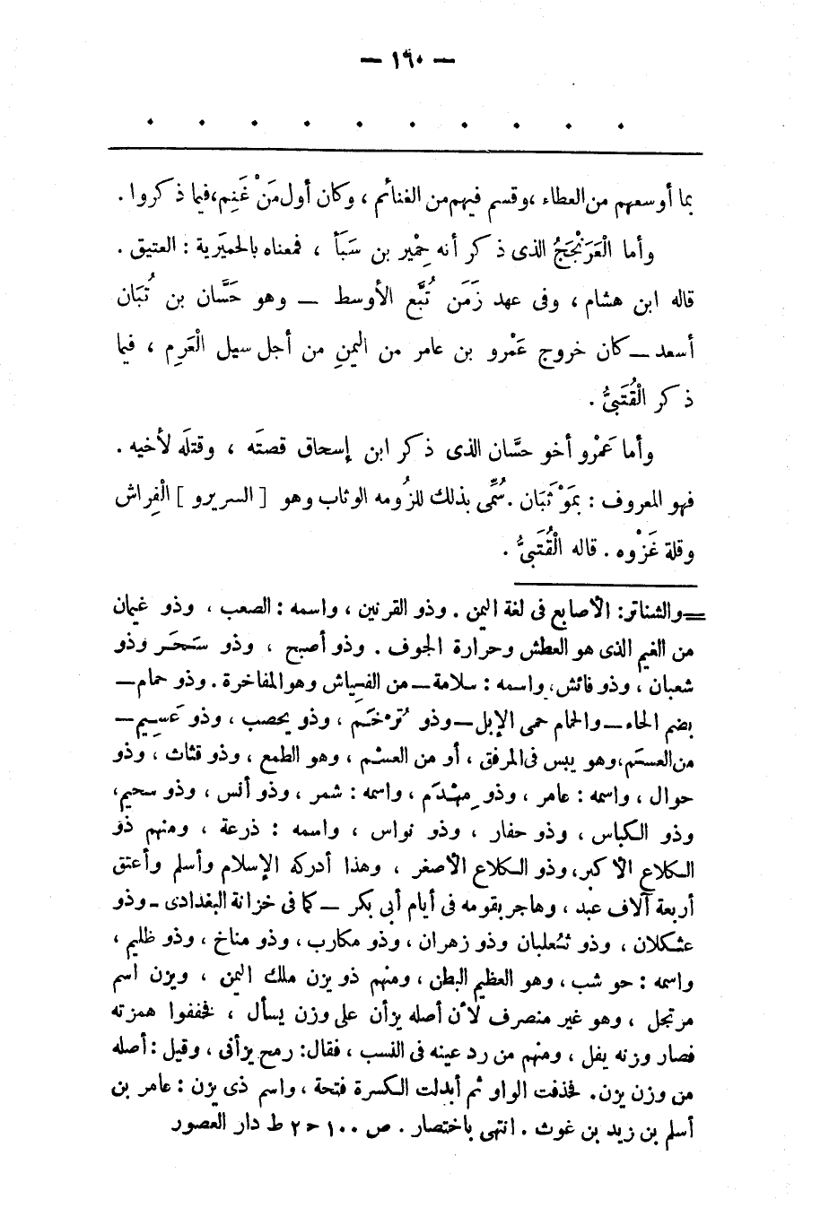 - والشناتر: الأصابع فى لغة اليمن. وذو القرنين، واسمه: الصعب، وذو غيمان من الغيم الذى هو العطش وحرارة الجوف. وذو أصبح، وذو سحر وذو شعبان، وذو فائش، واسمه: سلامة- من الفياش وهو المفاخرة. وذو حمام- بضم الحاء- والحمام حمى الإبل- وذو ترخم، وذو يحصب، وذو عسيم- من العسم، وهو يبس فى المرفق، أو من العسم، وهو الطمع، وذو قثاث، وذو حوال، واسمه: عامر، وذو مهدم، واسمه: شمر، وذو أنس، وذو سحيم، وذو الكباس، وذو حفار، وذو نواس، واسمه: ذرعة، ومنهم ذو الكلاع الأكبر، وذو الكلاع الأصغر، وهذا أدركه الإسلام وأسلم وأعتق أربعة آلاف عبد، وهاجر بقومه فى أيام أبى بكر- كما فى خزانة البغدادى- وذو عثكلان، وذو ثعلبان وذو زهران، وذو مكارب، وذو مناخ، وذو ظليم، واسمه: حو شب، وهو العظيم البطن، ومنهم ذو يزن ملك اليمن، ويزن اسم مرتجل، وهو غير منصرف لأن أصله يزأن على وزن يسأل، فخففوا همزته فصار وزنه يفل، ومنهم من رد عينه فى النسب، فقال: رمح يزأنى، وقيل: أصله من وزن يزن. فحذفت الواو ثم أبدلت الكسرة فتحة، واسم ذى يزن: عامر بن أسلم بن زيد بن غوث. انتهى باختصار. ص 100 ح 2 ط دار العصور