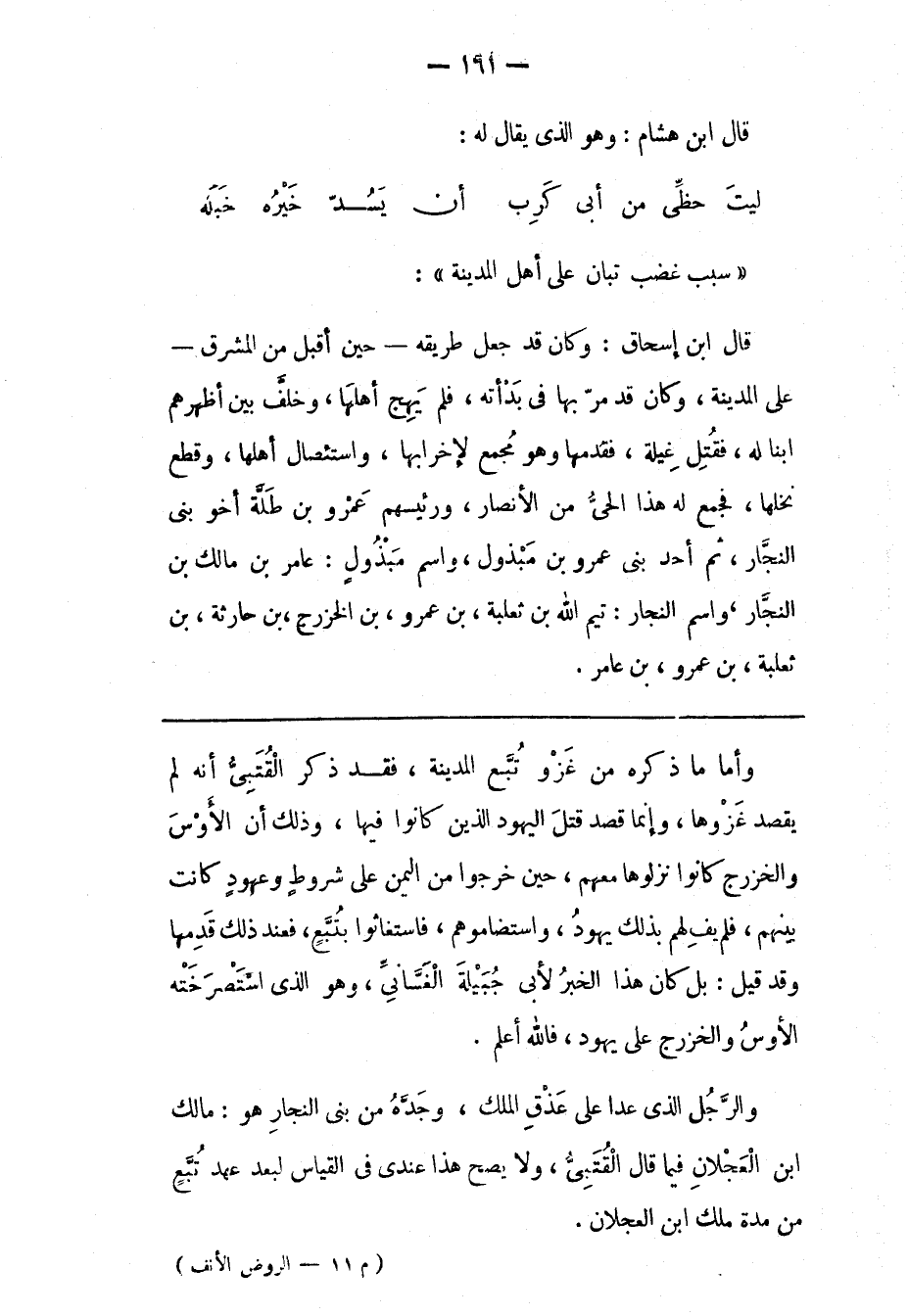 وَأَمّا مَا ذَكَرَهُ مِنْ غَزْوِ تُبّعٍ الْمَدِينَةِ، فَقَدْ ذَكَرَ الْقُتَبِيّ أَنّهُ لَمْ يَقْصِدْ غَزَوْهَا، وَإِنّمَا قَصَدَ قَتْلَ الْيَهُودِ الّذِينَ كَانُوا فِيهَا، وَذَلِكَ أَنّ الْأَوْسَ وَالْخَزْرَجَ كَانُوا نَزَلُوهَا مَعَهُمْ، حِينَ خَرَجُوا مِنْ الْيَمَنِ عَلَى شُرُوطٍ وَعُهُودٍ كَانَتْ بَيْنَهُمْ، فَلَمْ يَفِ لَهُمْ بِذَلِكَ يَهُودُ، وَاسْتَضَامُوهُمْ، فَاسْتَغَاثُوا بِتُبّعِ، فَعِنْدَ ذَلِكَ قَدِمَهَا وَقَدْ قِيلَ: بَلْ كَانَ هَذَا الْخَبَرُ لِأَبِي جُبَيْلَة الْغَسّانِيّ، وَهُوَ الّذِي اسْتَصْرَخَتْهُ الْأَوْسُ وَالْخَزْرَجُ عَلَى يَهُودَ، فَاَللهُ أَعْلَمُ.