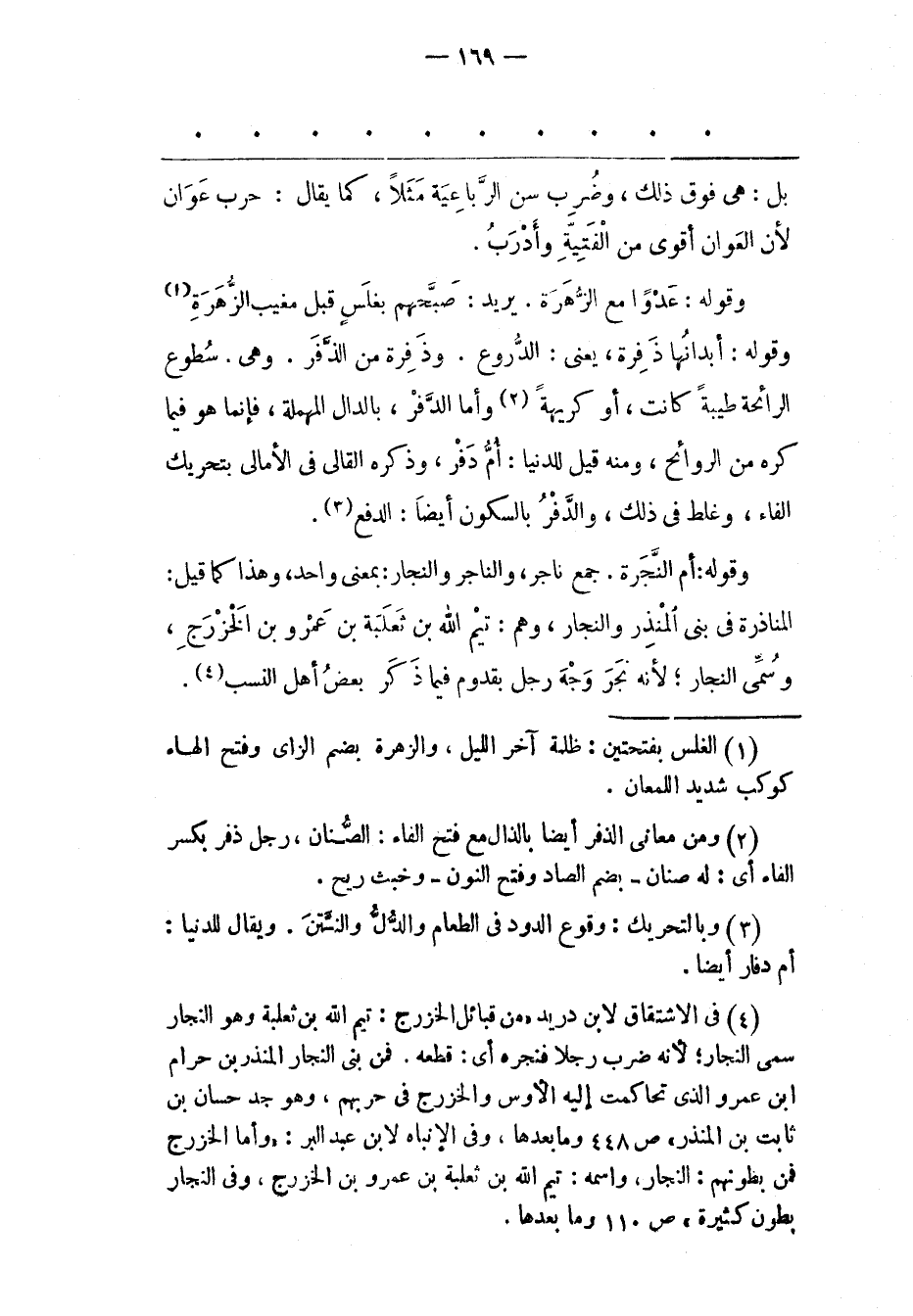 (4) فى الاشتقاق لابن دريد «من قبائل الخزرج: تيم الله بن ثعلبة وهو النجار سمى النجار؛ لأنه ضرب رجلا فنجره أى: قطعه. فمن بنى النجار المنذر بن حرام ابن عمرو الذى تحاكمت إليه الأوس والخزرج فى حربهم، وهو جد حسان بن ثابت بن المنذر» ص 448 وما بعدها، وفى الإنباه لابن عبد البر: «وأما الخزرج فمن بطونهم: النجار، واسمه: تَيْمُ اللهِ بْنُ ثَعْلَبَةَ بْنِ عَمْرِو بْنِ الخزرج، وفى النجار بطون كثيرة» ص 110 وما بعدها.