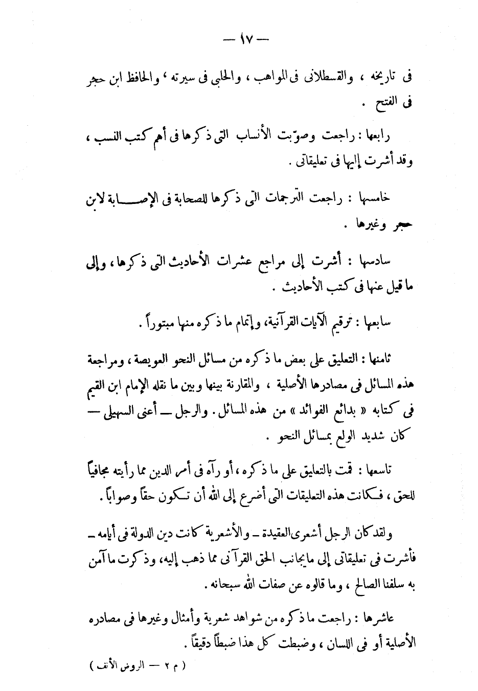 تاسعها: قمت بالتعليق على ما ذكره، أو رآه فى أمر الدين مما رأيته مجافيا للحق، فكانت هذه التعليقات التى أضرع إلى الله أن تكون حقا وصوابا.