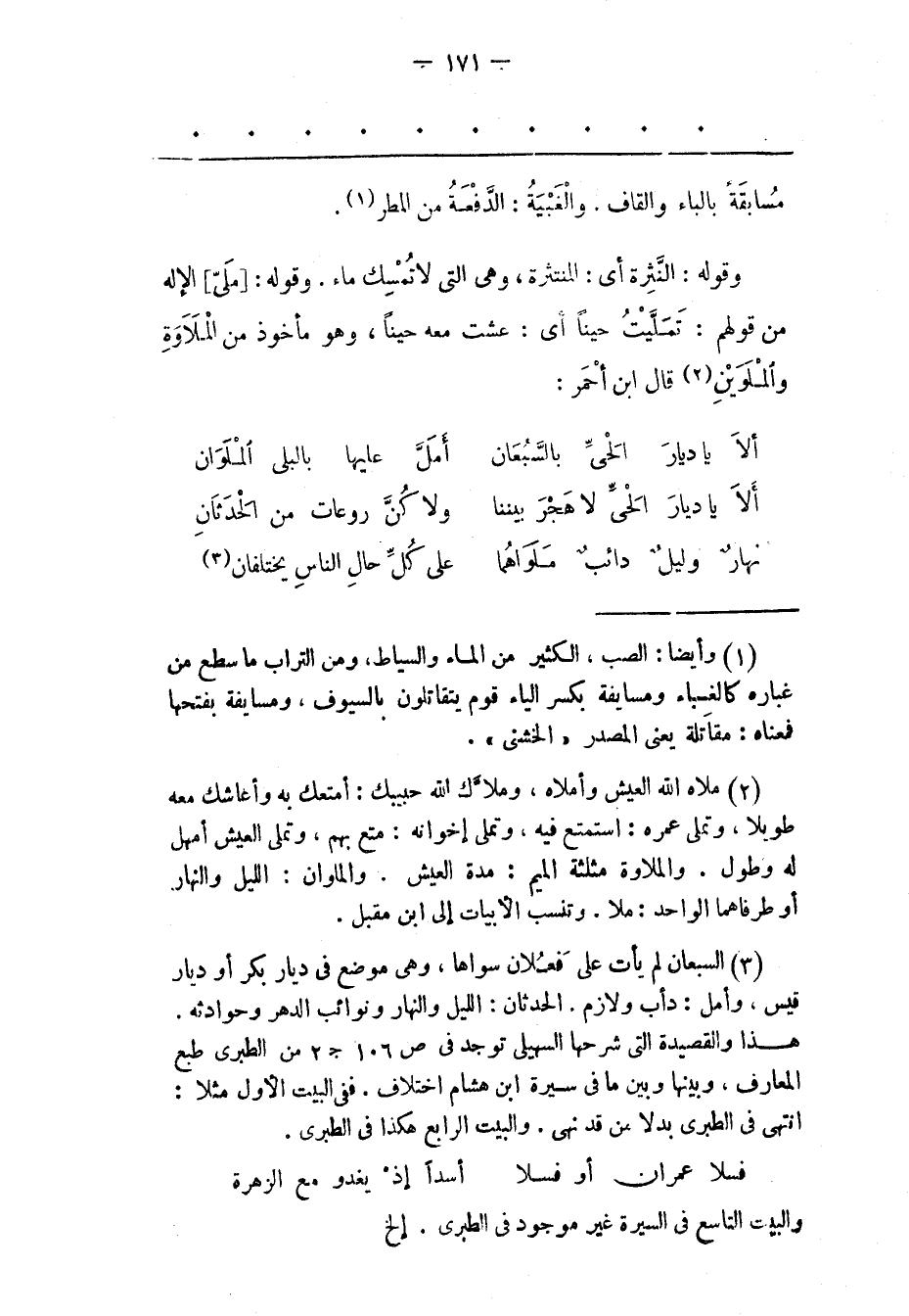 (3) السبعان لم يأت على فعلان سواها، وهى موضع فى ديار بكر أو ديار قيس، وأمل: دأب ولازم. الحدثان: الليل والنهار ونوائب الدهر وحوادثه. هذا والقصيدة التى شرحها السهيلى توجد فى ص 106 ج 2 من الطبرى طبع المعارف، وبينها وبين ما فى سيرة ابن هشام اختلاف. ففى البيت الأول مثلا: انتهى فى الطبرى بدلا من قد نهى. والبيت الرابع هكذا فى الطبرى.