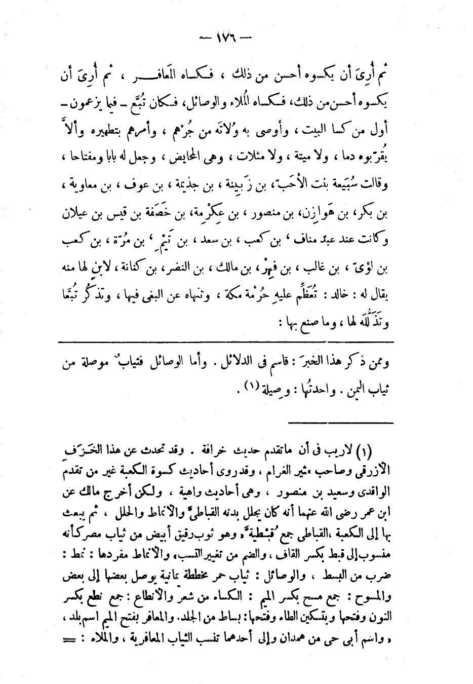 (1) لا ريب فى أن ما تقدم حديث خرافة. وقد تحدث عن هذا الخزف الأزرقى وصاحب مثير الغرام، وقد روى أحاديث كسوة الكعبة غير من تقدم الواقدى وسعيد بن منصور، وهى أحاديث واهية، ولكن أخرج مالك عن ابن عمر رضى الله عنهما أنه كان يجلل بدنه القباطىّ والأنماط والحلل، ثم يبعث بها إلى الكعبة، القباطى جمع قبطيةّ «وهو ثوب رقيق أبيض من ثياب مصر كأنه منسوب إلى قبط بكسر القاف، والضم من تغيير التسب» والأنماط مفردها: نمط: ضرب من البسط، والوصائل: ثياب حمر مخططة يمانية يوصل بعضها إلى بعض والمسوح: جمع مسح بكسر الميم: الكساء من شعر والأنطاع: جمع نطع بكسر النون وفتحها وبتسكين الطاء وفتحها: بساط من الجلد. والمعافر بفتح الميم اسم بلد، «واسم أبى حى من همدان وإلى أحدهما تنسب الثياب المعافرية، والملاء: -
