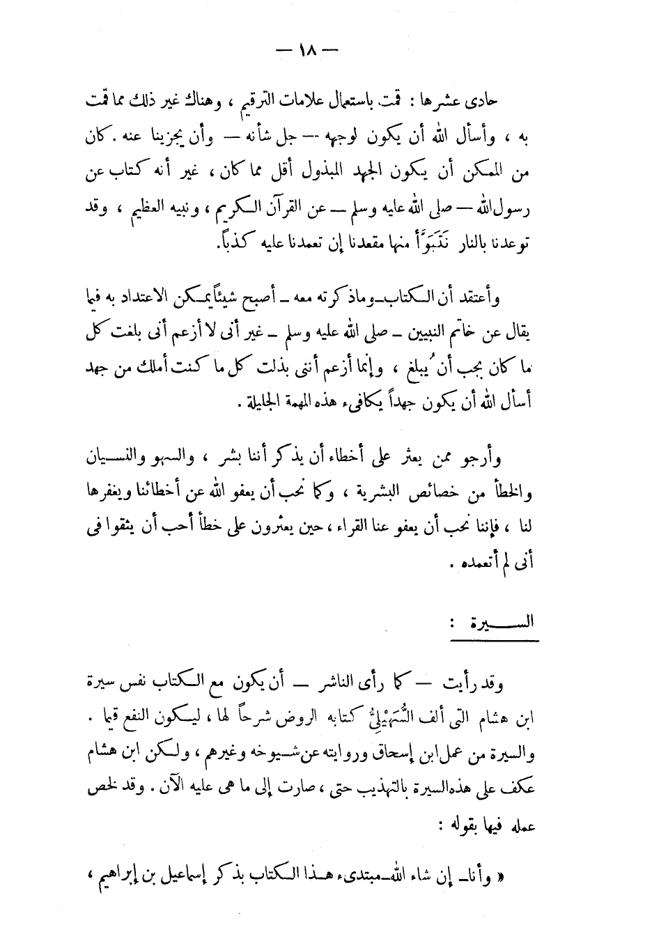 وقد رأيت- كما رأى الناشر- أن يكون مع الكتاب نفس سيرة ابن هشام التى ألف السّهيلىّ كتابه الروض شرحا لها، ليكون النفع قيما.