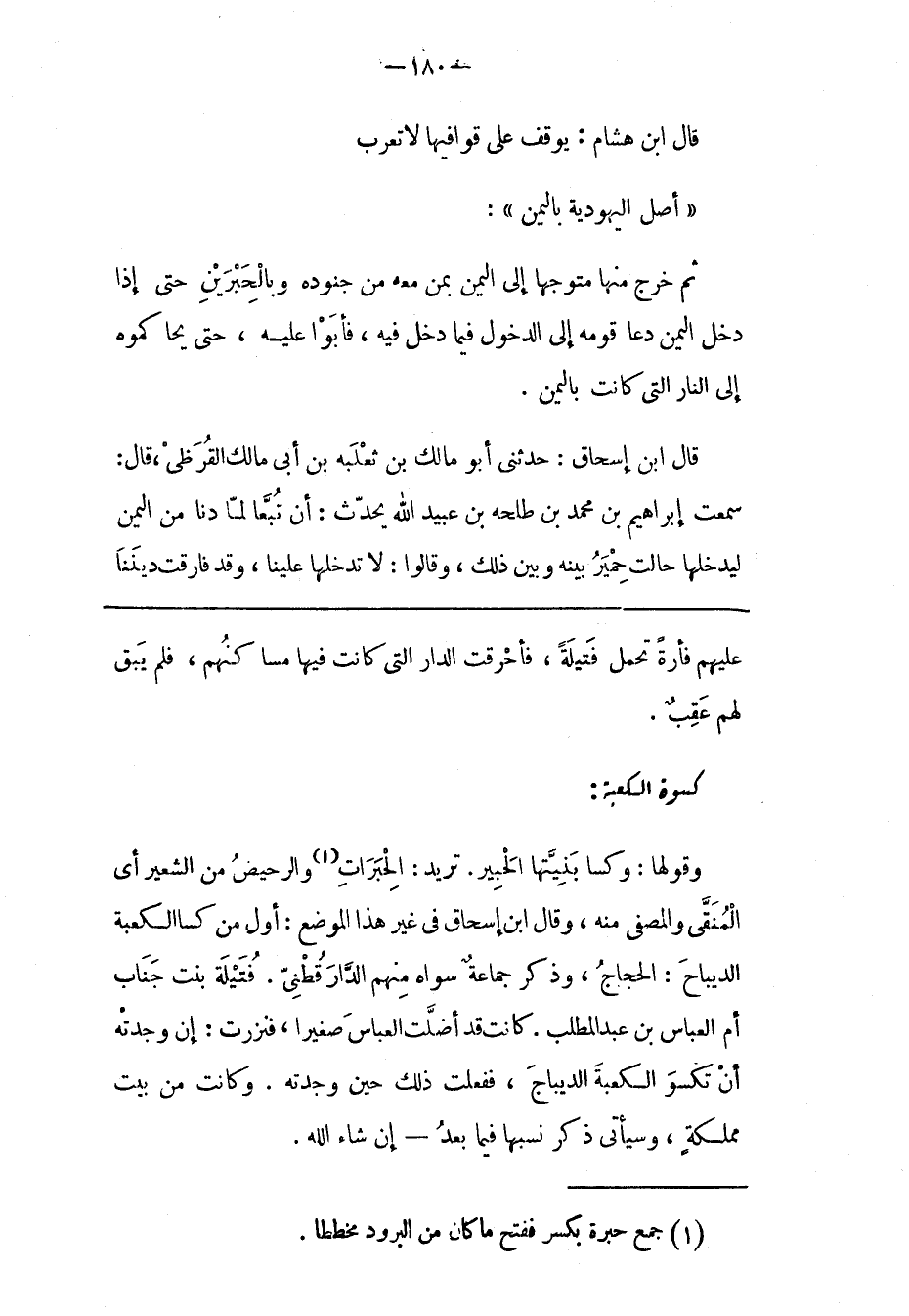 وَقَوْلُهَا: وَكَسَا بَنِيّتَهَا الْحَبِيرُ. تُرِيدُ: الْحَبِرَاتِ «1» وَالرّحِيضُ مِنْ الشّعِيرِ أَيْ الْمُنَقّى وَالْمُصَفّى مِنْهُ، وَقَالَ ابْنُ إسْحَاقَ فِي غَيْرِ هَذَا الْمَوْضِعِ: أَوّلُ مَنْ كَسَا الْكَعْبَةَ الديباح: الْحَجّاجُ، وَذَكَرَ جَمَاعَةً سِوَاهُ مِنْهُمْ الدّارَقُطْنِيّ. فُتَيْلَةُ بِنْتُ جَنَابٍ أُمّ الْعَبّاسِ بْنِ عَبْدِ الْمُطّلِبِ. كَانَتْ قَدْ أَضَلّتْ الْعَبّاسَ صَغِيرًا، فَنَزَرَتْ: إنْ وَجَدَتْهُ أَنْ تَكْسُو الْكَعْبَةَ الدّيبَاجَ، فَفَعَلَتْ ذَلِكَ حِينَ وَجَدَتْهُ. وَكَانَتْ مِنْ بَيْتِ مَمْلَكَةٍ، وَسَيَأْتِي ذِكْرُ نَسَبِهَا فِيمَا بَعْدُ- إنْ شَاءَ اللهُ.