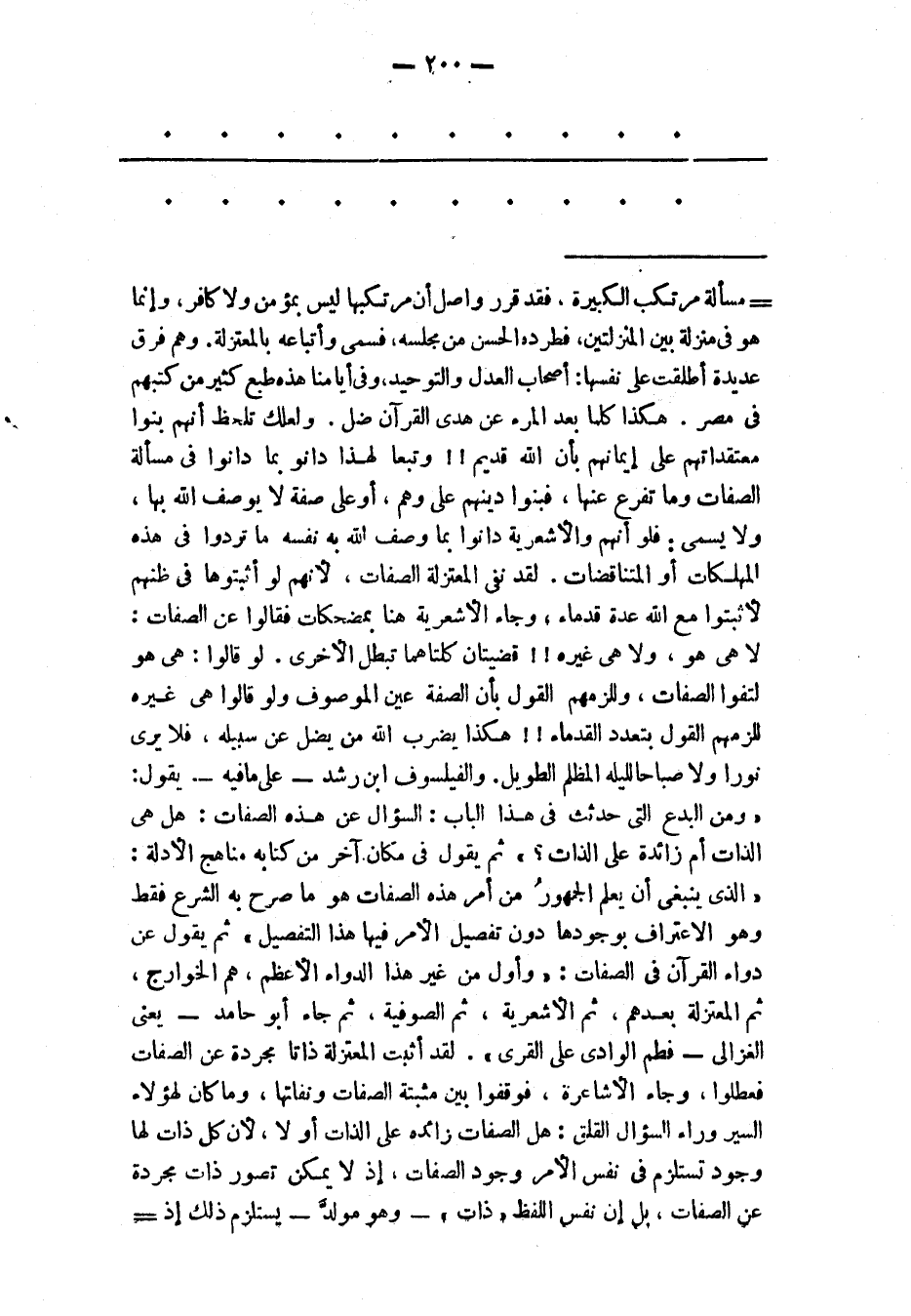 مسألة مرتكب الكبيرة، فقد قرر واصل أن مرتكبها ليس بمؤمن ولا كافر، وإنما هو فى منزلة بين المنزلتين، فطرده الحسن من مجلسه، فسمى وأتباعه بالمعتزلة. وهم فرق عديدة أطلقت على نفسها: أصحاب العدل والتوحيد، وفى أيامنا هذه طبع كثير من كتبهم فى مصر. هكذا كلما بعد المرء عن هدى القرآن ضل. ولعلك تلحظ أنهم بنوا معتقداتهم على إيمانهم بأن الله قديم!! وتبعا لهذا دانو بما دانوا فى مسألة الصفات وما تفرع عنها، فبنوا دينهم على وهم، أو على صفة لا يوصف الله بها، ولا يسمى: فلو أنهم والأشعرية دانوا بما وصف الله به نفسه ما تردوا فى هذه المهلكات أو المتناقضات. لقد نفى المعتزلة الصفات، لأنهم لو أثبتوها فى ظنهم لأثبتوا مع الله عدة قدماء، وجاء الأشعرية هنا بمضحكات فقالوا عن الصفات: لا هى هو، ولا هى غيره!! قضيتان كلتاهما تبطل الأخرى. لو قالوا: هى هو لتفوا الصفات، وللزمهم القول بأن الصفة عين الموصوف ولو قالوا هى غيره للزمهم القول بتعدد القدماء!! هكذا يضرب الله من يضل عن سبيله، فلا يرى نورا ولا صباحا لليله المظلم الطويل. والفيلسوف ابن رشد- على ما فيه- يقول: «ومن البدع التى حدثث فى هذا الباب: السؤال عن هذه الصفات: هل هى الذات أم زائدة على الذات؟» ثم يقول فى مكان آخر من كتابه مناهج الأدلة: «الذى ينبغى أن يعلم الجمهور من أمر هذه الصفات هو ما صرح به الشرع فقط وهو الاعتراف بوجودها دون تفصيل الأمر فيها هذا التفصيل» ثم يقول عن دواء القرآن فى الصفات: «وأول من غير هذا الدواء الأعظم، هم الخوارج، ثم المعتزلة بعدهم، ثم الأشعرية، ثم الصوفية، ثم جاء أبو حامد- يعنى الغزالى- فطم الوادى على القرى» . لقد أثبت المعتزلة ذاتا مجردة عن الصفات فعطلوا، وجاء الأشاعرة، فوقفوا بين مثبتة الصفات ونفاتها، وما كان لهؤلاء السير وراء السؤال القلق: هل الصفات زائده على الذات أو لا، لأن كل ذات لها وجود تستلزم فى نفس الأمر وجود الصفات، إذ لا يمكن تصور ذات مجردة عن الصفات، بل إن نفس اللفظ «ذات» - وهو مولدّ- يستلزم ذلك إذ-