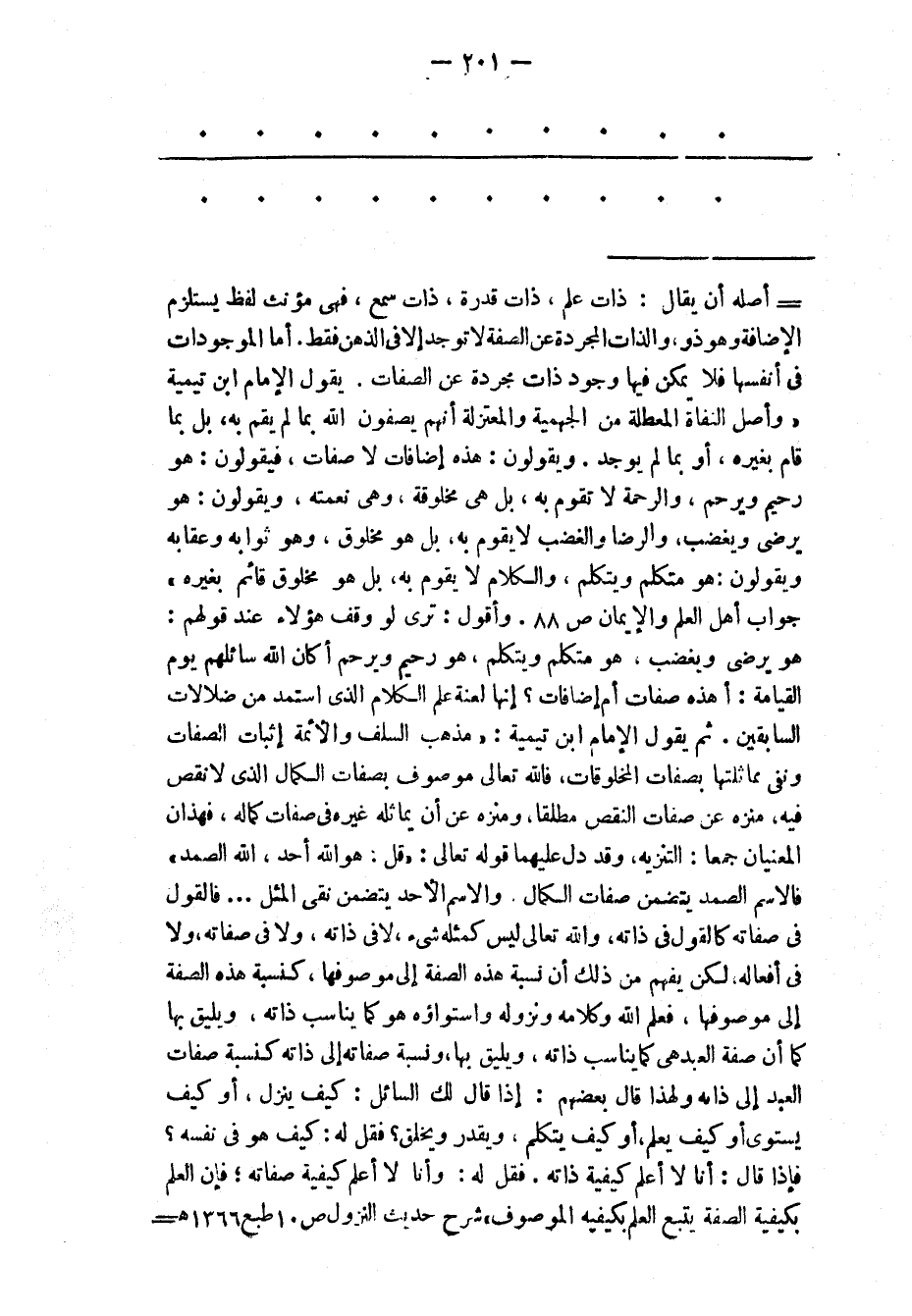 أصله أن يقال: ذات علم، ذات قدرة، ذات سمع، فهى مؤنث لفظ يستلزم الإضافة وهو ذو، والذات المجردة عن الصفة لا توجد إلا فى الذهن فقط. أما الموجودات فى أنفسها فلا يمكن فيها وجود ذات مجردة عن الصفات. يقول الإمام ابن تيمية «وأصل النفاة المعطلة من الجهمية والمعتزلة أنهم يصفون الله بما لم يقم به، بل بما قام بغيره، أو بما لم يوجد. ويقولون: هذه إضافات لا صفات، فيقولون: هو رحيم ويرحم، والرحمة لا تقوم به، بل هى مخلوقة، وهى نعمته، ويقولون: هو يرضى ويغضب، والرضا والغضب لا يقوم به، بل هو مخلوق، وهو ثوابه وعقابه ويقولون: هو متكلم ويتكلم، والكلام لا يقوم به، بل هو مخلوق قائم بغيره» جواب أهل العلم والإيمان ص 88. وأقول: ترى لو وقف هؤلاء عند قولهم: هو يرضى ويغضب، هو متكلم ويتكلم، هو رحيم ويرحم أكان الله سائلهم يوم القيامة: أهذه صفات أم إضافات؟ إنها لعنة علم الكلام الذى استمد من ضلالات السابقين. ثم يقول الإمام ابن تيمية: «مذهب السلف والأئمة إثبات الصفات ونفى مماثلتها بصفات المخلوقات، فالله تعالى موصوف بصفات الكمال الذى لا نقص فيه، منزه عن صفات النقص مطلقا، ومنزه عن أن يماثله غيره فى صفات كماله، فهذان المعنيان جمعا: التنزيه، وقد دل عليهما قوله تعالى: «قُلْ: هُوَ اللَّهُ أَحَدٌ، اللَّهُ الصَّمَدُ» فالاسم الصمد يتضمن صفات الكمال. والاسم الأحد يتضمن نقى المثل ... فالقول فى صفاته كالقول فى ذاته، والله تعالى ليس كمثله شئ، لا فى ذاته، ولا فى صفاته، ولا فى أفعاله، لكن يفهم من ذلك أن نسبة هذه الصفة إلى موصوفها، كنسبة هذه الصفة إلى موصوفها، فعلم الله وكلامه ونزوله واستواؤه هو كما يناسب ذاته، ويليق بها كما أن صفة العبد هى كما يناسب ذاته، ويليق بها، ونسبة صفاته إلى ذاته كنسبة صفات العبد إلى ذاته ولهذا قال بعضهم: إذا قال لك السائل: كيف ينزل، أو كيف يستوى أو كيف يعلم، أو كيف يتكلم، ويقدر ويخلق؟ فقل له: كيف هو فى نفسه؟ فإذا قال: أنا لا أعلم كيفية ذاته. فقل له: وأنا لا أعلم كيفية صفاته؛ فإن العلم بكيفية الصفة يتبع العلم بكيفية الموصوف» شرح حديث النزول ص 10 طبع 1366 هـ-