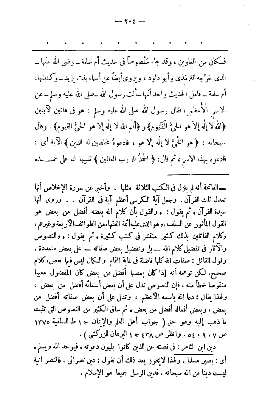 أُمّ سَلَمَةَ- فَلَعَلّ الْحَدِيثَ وَاحِدٌ أَنّهَا سَأَلَتْ رَسُولَ اللهِ- صَلَّى اللَّهُ عَلَيْهِ وَسَلَّمَ- عَنْ الِاسْمِ الْأَعْظَمِ، فَقَالَ رسول الله صلى الله عليه وسلم: هو فى هَاتِينَ الْآيَتَيْنِ اللَّهُ لَا إِلهَ إِلَّا هُوَ الْحَيُّ الْقَيُّومُ والم اللَّهُ لَا إِلهَ إِلَّا هُوَ الْحَيُّ الْقَيُّومُ. وَقَالَ سُبْحَانَهُ: هُوَ الْحَيُّ لَا إِلهَ إِلَّا هُوَ، فَادْعُوهُ مُخْلِصِينَ لَهُ الدِّينَ الْآيَةَ أَيْ: