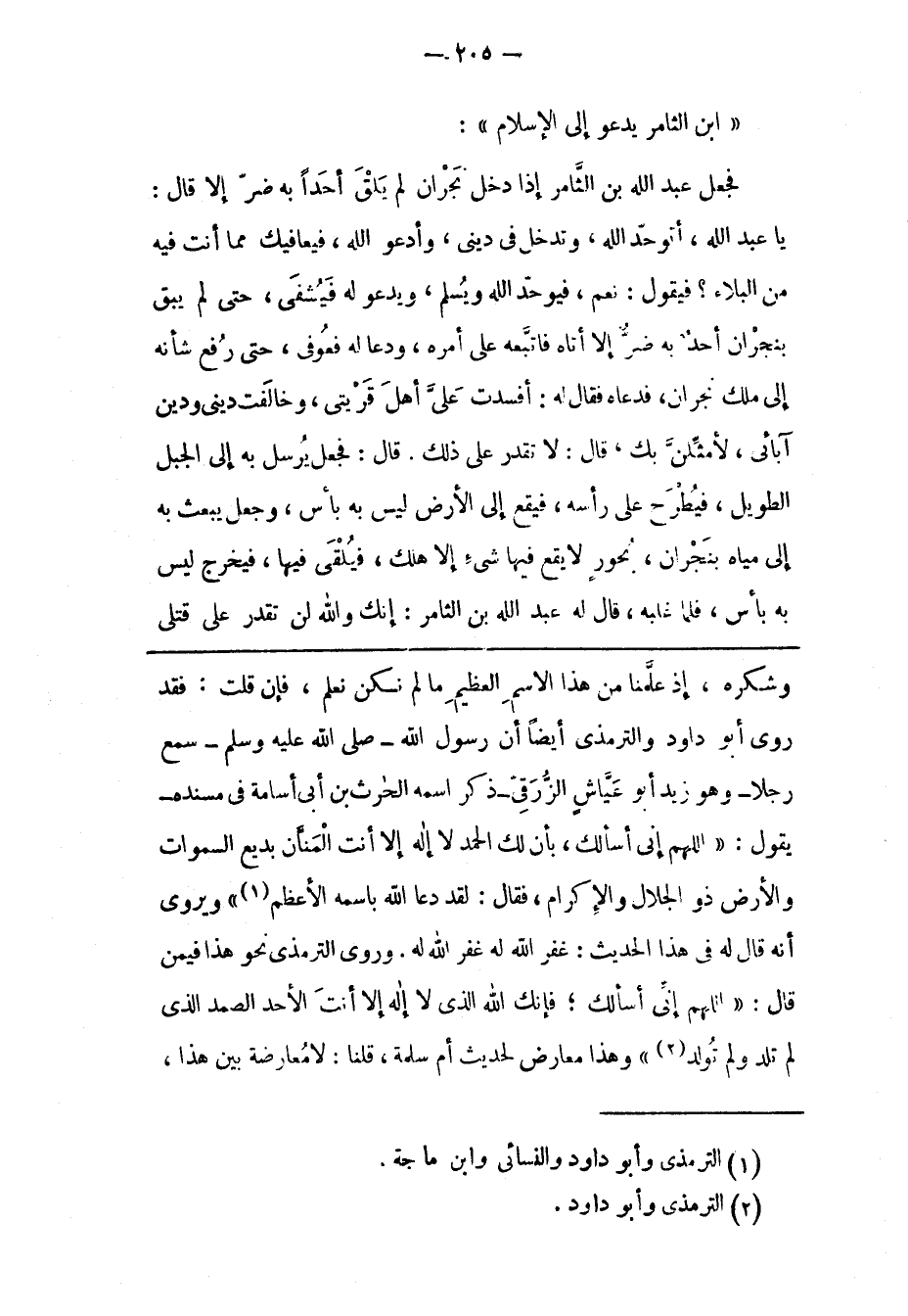 يَا عَبْدَ اللهِ، أَتُوَحّدُ اللهَ، وَتَدْخُلُ فِي دِينِي، وَأَدْعُو اللهَ، فَيُعَافِيك مِمّا أَنْتَ فِيهِ مِنْ الْبَلَاءِ؟ فَيَقُولُ: نَعَمْ، فَيُوَحّدُ اللهَ وَيُسْلِمُ، وَيَدْعُو لَهُ فَيُشْفَى، حَتّى لَمْ يَبْقَ بِنَجْرَانَ أَحَدٌ بِهِ ضُرّ إلّا أَتَاهُ فَاتّبَعَهُ عَلَى أَمْرِهِ، وَدَعَا لَهُ فَعُوفِيَ، حَتّى رُفِعَ شَأْنُهُ إلَى مَلِكِ نَجْرَانَ، فَدَعَاهُ فَقَالَ لَهُ: أَفْسَدْت عَلَيّ أَهْلَ قَرْيَتِي، وَخَالَفْت دِينِي وَدِينَ آبَائِي، لَأُمَثّلَنّ بِك، قَالَ: لَا تَقْدِرُ عَلَى ذَلِكَ. قَالَ: فَجَعَلَ يُرْسِلُ بِهِ إلَى الْجَبَلِ الطّوِيلِ، فَيُطْرَحُ عَلَى رَأْسِهِ، فَيَقَعُ إلَى الْأَرْضِ لَيْسَ بِهِ بَأْسٌ، وَجَعَلَ يَبْعَثُ بِهِ إلَى مِيَاهٍ بنجران، بحور لا يقع فيها شئ إلّا هَلَكَ، فَيُلْقَى فِيهَا، فَيَخْرُجُ لَيْسَ بِهِ بَأْسٌ، فَلَمّا غَلَبَهُ، قَالَ لَهُ عَبْدُ اللهِ بْنُ الثّامِرِ: إنّك وَاَللهِ لَنْ تَقْدِرَ عَلَى قتلى