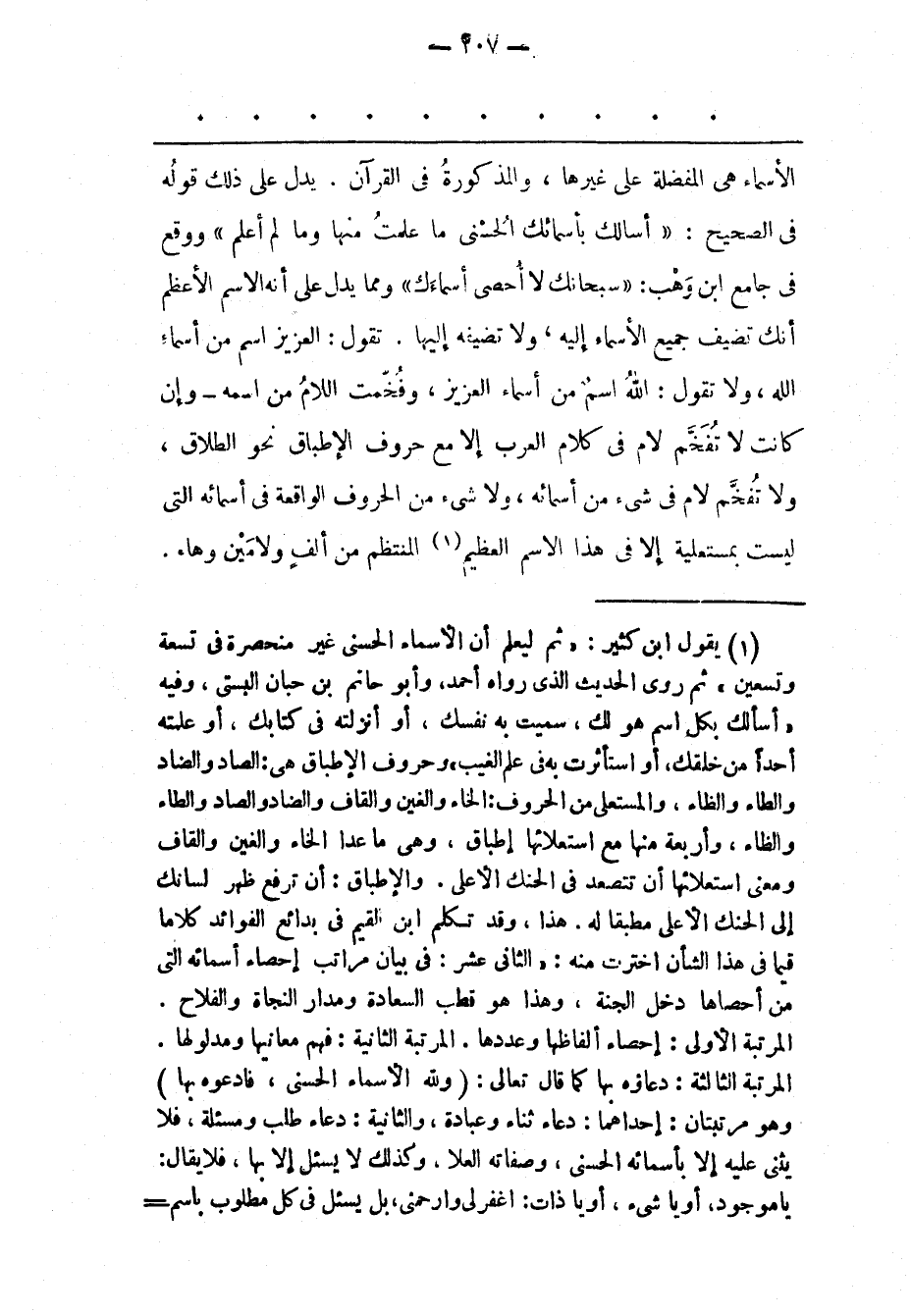 (1) يقول ابن كثير: «ثم ليعلم أن الأسماء الحسنى غير منحصرة فى تسعة وتسعين» ثم روى الحديث الذى رواه أحمد، وأبو حاتم بن حبان البستى، وفيه «أسألك بكل اسم هو لك، سميت به نفسك، أو أنزلته فى كتابك، أو علمته أحدا من خلقك، أو استأثرت به فى علم الغيب» وحروف الإطباق هى: الصاد والضاد والطاء والظاء، والمستعلى من الحروف: الخاء والغين والقاف والضاد والصاد والطاء والظاء، وأربعة منها مع استعلائها إطباق، وهى ما عدا الخاء والغين والقاف ومعنى استعلائها أن تتصعد فى الحنك الأعلى. والإطباق: أن ترفع ظهر لسانك إلى الحنك الأعلى مطبقا له. هذا، وقد تكلم ابن القيم فى بدائع الفوائد كلاما قيما فى هذا الشأن اخترت منه: «الثانى عشر: فى بيان مراتب إحصاء أسمائه التى من أحصاها دخل الجنة، وهذا هو قطب السعادة ومدار النجاة والفلاح. المرتبة الأولى: إحصاء ألفاظها وعددها. المرتبة الثانية: فهم معانيها ومدلولها. المرتبة الثالثة: دعاؤه بها كما قال تعالى: (وَلِلَّهِ الْأَسْماءُ الْحُسْنى، فَادْعُوهُ بِها) وهو مرتبتان: إحداهما: دعاء ثناء وعبادة، والثانية: دعاء طلب ومسئلة، فلا يثنى عليه إلا بأسمائه الحسنى، وصفاته العلا، وكذلك لا يسئل إلا بها، فلا يقال: يا موجود، أو يا شئ، أو يا ذات: اغفرلى وارحمنى، بل يسئل فى كل مطلوب باسم-