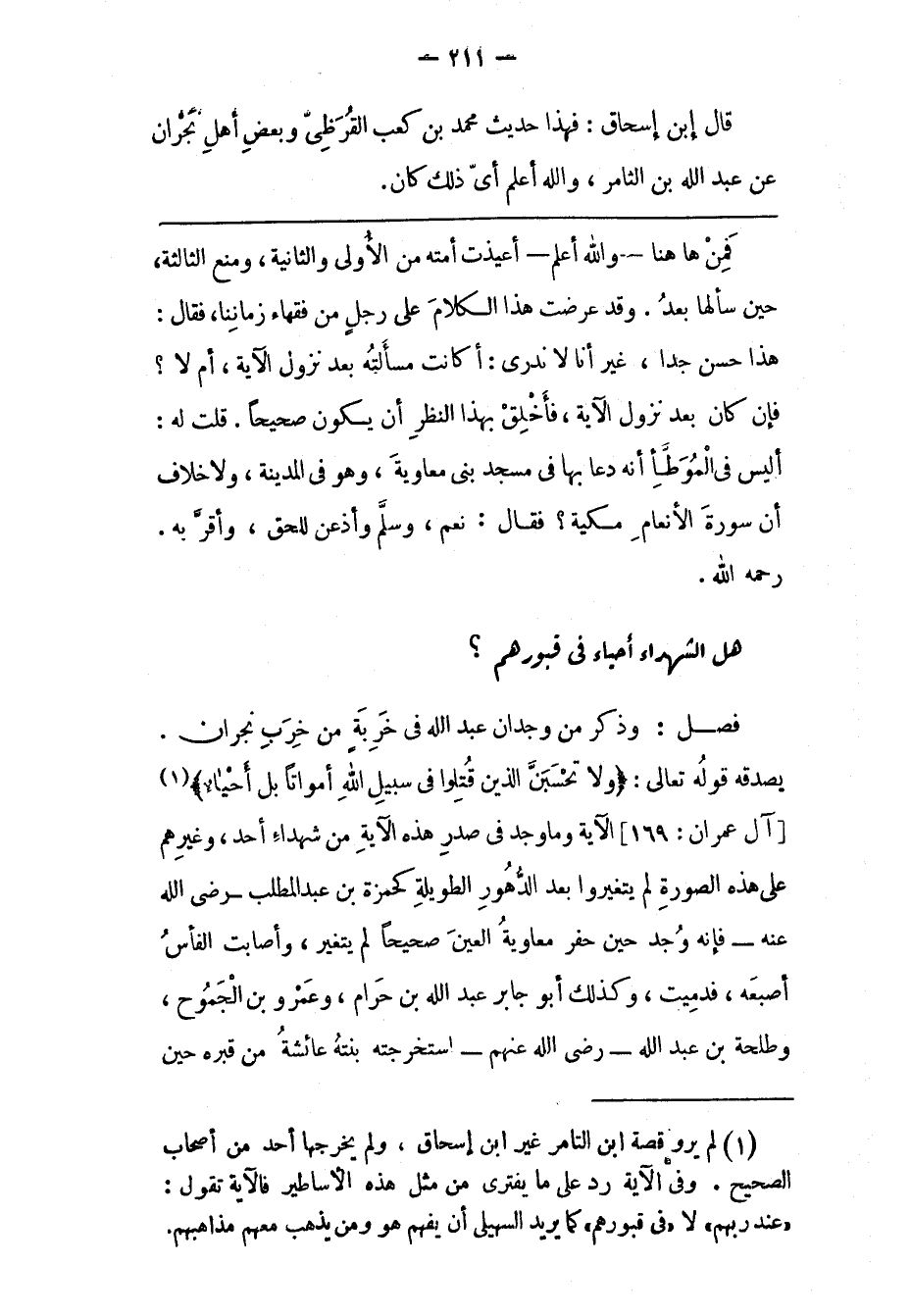 (1) لم يرو قصة ابن التامر غير ابن إسحاق، ولم يخرجها أحد من أصحاب الصحيح. وفى الآية رد على ما يفترى من مثل هذه الأساطير فالآية تقول: «عند ربهم» لا «فى قبورهم» كما يريد السهيلى أن يفهم هو ومن يذهب معهم مذاهبهم.