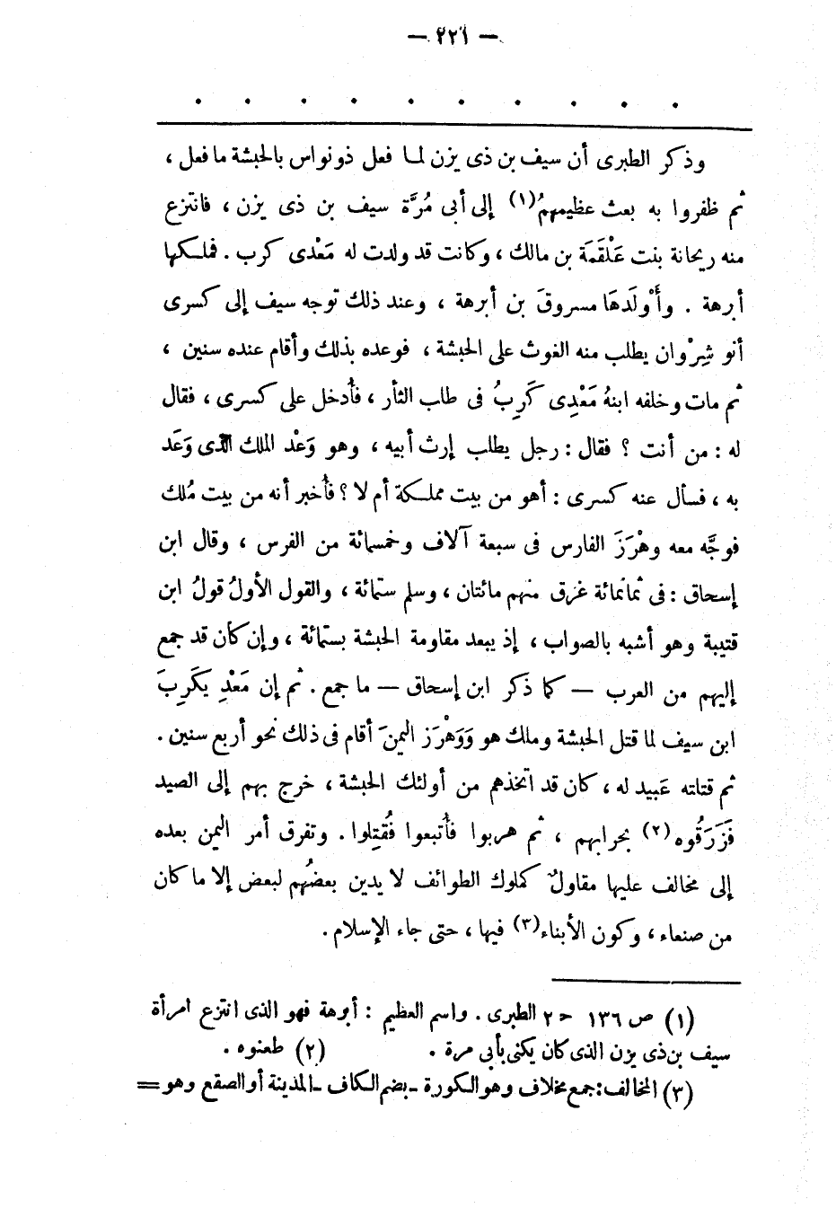 وَذَكَرَ الطّبَرِيّ أَنّ سَيْفَ بْنَ ذِي يَزَنَ لَمّا فَعَلَ ذُو نُوَاسٍ بِالْحَبَشَةِ مَا فَعَلَ، ثُمّ ظَفَرُوا بِهِ بَعَثَ عَظِيمُهُمْ «1» إلَى أَبِي مُرّةَ سَيْفِ بْنِ ذِي يَزَنَ، فَانْتَزَعَ مِنْهُ رَيْحَانَةَ بِنْتَ عَلْقَمَةَ بْنِ مَالِكٍ، وَكَانَتْ قَدْ وَلَدَتْ لَهُ مَعْدِي كَرِب. فَمَلَكَهَا أَبْرَهَةُ. وَأَوْلَدَهَا مَسْرُوقَ بْنَ أَبْرَهَةَ، وَعِنْدَ ذَلِكَ تَوَجّهَ سَيْفٌ إلَى كِسْرَى أَنُوشِرْوَانَ يَطْلُبُ مِنْهُ الْغَوْثَ عَلَى الْحَبَشَةِ، فَوَعَدَهُ بِذَلِكَ وَأَقَامَ عِنْدَهُ سِنِينَ، ثُمّ مَاتَ وَخَلّفَهُ ابْنه مَعْدِي كَرِب فِي طَلَبِ الثّأْرِ، فَأَدْخَلَ عَلَى كِسْرَى، فَقَالَ لَهُ: مَنْ أَنْتَ؟ فَقَالَ: رَجُلٌ يَطْلُبُ إرْثَ أَبِيهِ، وَهُوَ وَعْدُ الْمَلِكِ الّذِي وَعَدَ بِهِ، فَسَأَلَ عَنْهُ كِسْرَى: أَهُوَ مِنْ بَيْتِ مَمْلَكَةٍ أَمْ لَا؟ فَأُخْبِرَ أَنّهُ مِنْ بَيْتِ مُلْكٍ فَوَجّهَ مَعَهُ وَهْرَزَ الْفَارِسَ فِي سَبْعَةِ آلَافٍ وَخَمْسِمِائَةِ مِنْ الْفُرْسِ، وَقَالَ ابْنُ إسْحَاقَ: فِي ثَمَانِمِائَةِ غَرِقَ مِنْهُمْ مِائَتَانِ، وَسَلِمَ سِتّمِائَةٍ، وَالْقَوْلُ الْأَوّلُ قَوْلُ ابْنِ قُتَيْبَةَ وَهُوَ أَشْبَهُ بِالصّوَابِ، إذْ يَبْعُدُ مُقَاوَمَةُ الْحَبَشَةِ بِسِتّمِائَةِ، وَإِنْ كَانَ قَدْ جَمَعَ إلَيْهِمْ مِنْ الْعَرَبِ- كَمَا ذَكَرَ ابْنُ إسْحَاقَ- ما جمع. ثم إن معد يكرب ابن سَيْفٍ لَمّا قَتَلَ الْحَبَشَةَ وَمَلَكَ هُوَ وَوَهْرَزَ الْيَمَنَ أَقَامَ فِي ذَلِكَ نَحْوَ أَرْبَعِ سِنِينَ.