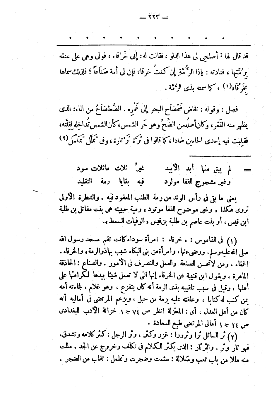 (1) فى القاموس: «خرقاء: امرأة سوداء كانت تقم مسجد رسول الله صلى الله عليه وسلم، ورضى عنها، وامرأة من بنى البكاء شبب بها ذو الرمة» والخرقاء. الحمقاء، ومن لا تحسن الصنعة والعمل والتصرف فى الأمور. والصناع: الحاذقة الماهرة، ويقول ابن قتيبة عن الخرقاء إنها التى لا تعمل شيئا بيدها لكرامتها على أهلها، وقيل فى سبب تلقيبه بذى الرمة أنه كان يتفزع، وهو غلام، فجاءته أمه بمن كتب له كتابا، وعلقته عليه برمة من حبل، ويزعم المرتضى فى أماليه أنه كان من أهل العدل، أى: المعتزلة انظر ص 74 ج 1 خزانة الأدب للبغدادى ص 14 ج 1 أمالى المرتضى طبع السعادة.