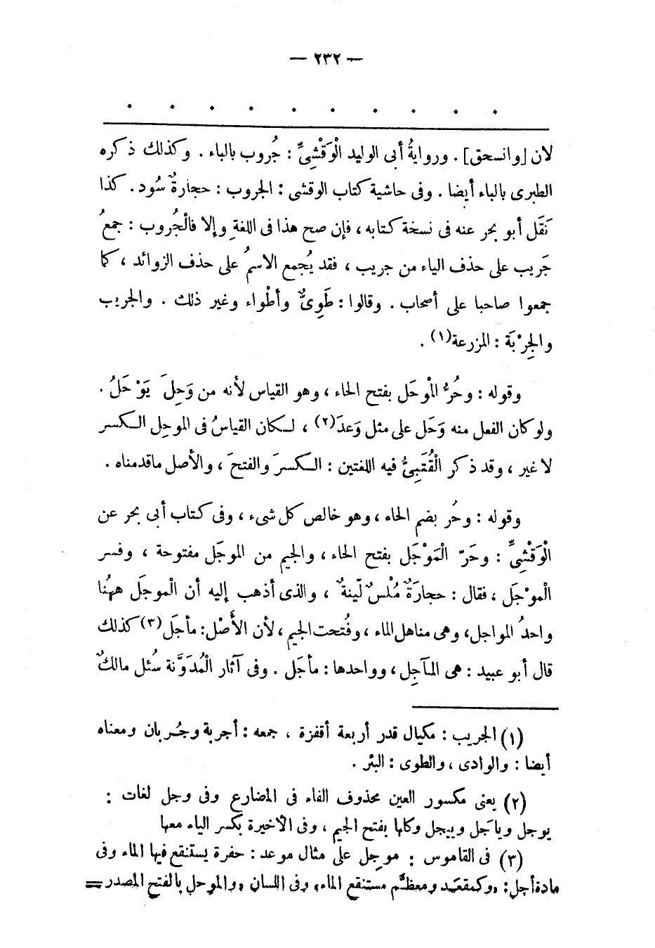 وَقَوْلُهُ: وحر بضم الحاء، وهو خالص كل شئ، وَفِي كِتَابِ أَبِي بَحْرٍ عَنْ الْوَقْشِيّ: وَحَرّ الموجل بِفَتْحِ الْحَاءِ، وَالْجِيمُ مِنْ الْمَوْجَلِ مَفْتُوحَةٌ، وَفَسّرَ الْمَوْجَلَ، فَقَالَ: حِجَارَةٌ مُلْسٌ لَيّنَةٌ، وَاَلّذِي أَذْهَبُ إلَيْهِ أَنّ الْمَوْجَلَ هَهُنَا وَاحِدُ الْمَوَاجِلِ، وَهِيَ مَنَاهِلُ الْمَاءِ، وَفُتِحَتْ الْجِيمُ، لِأَنّ الْأَصْلَ: مَأْجَلٌ «3» كَذَلِكَ قَالَ أَبُو عُبَيْدٍ: هِيَ الْمَآجِلُ، وَوَاحِدُهَا: مأجل. وفى آثار المدوّنة سئل مالك